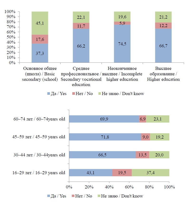 Однако, рассматривая оценки респондентов в разрезе возрастных групп и образовательного уровня, мы видим ряд особенностей, позволяющих говорить о дифференциации показателей восприятия (рис. 5 и 6).