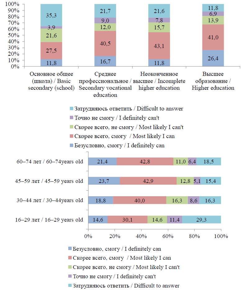Так, среди респондентов в возрастной группе 16–29 лет только 43,1 % однозначно связывают свое будущее с городом проживания, в то время как в других возрастных группах значения утвердительно ответивших колеблются от 66,5 % в возрастной группе 30–44 лет до 71,8 % в возрастной группе 60–74 лет. Наибольшее число респондентов, однозначно не связывающих свое будущее с г. о. Костомукша и затруднившихся с ответом, наблюдается в возрастной группе 16–29 лет (19,5 и 37,4 % соответственно). Схожие различия между возрастными группами мы видим и в оценках возможности реализовать свои жизненные планы в месте проживания.