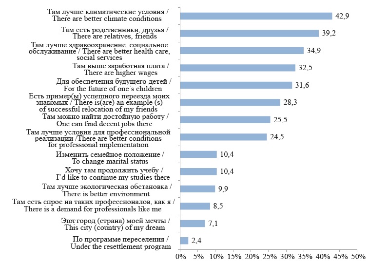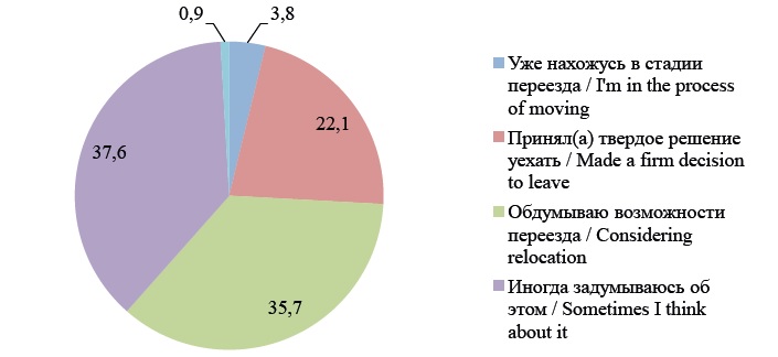 Мы видим, что наибольшую готовность к переезду имеют 25,9 % выразивших желание уехать из города (или 8,0 % от всей выборочной совокупности), из них 3,8 % – уже находятся на стадии переезда. Среди причин, определяющих желание переехать, наиболее часто респонденты выделяют климатические особенности, родственные связи, поиск лучших условий здравоохранения, необходимость обеспечения будущего детей, а также совокупность причин, связанных с условиями и возможностью трудовой самореализации.