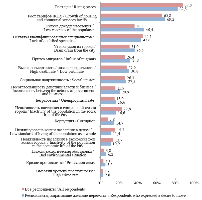 Среди наиболее значимых проблем7 опрошенные отметили рост цен (87,9 %), рост тарифов ЖКХ (65,7), нехватку квалифицированных специалистов (44,9) и низкие доходы населения (36,4 %), что в целом совпадает с оценками удовлетворенности условиями жизни и связано в большей мере с макроэкономической проблемой инфляции в России (кроме третьего пункта). Среди наиболее выраженных сугубо локальных проблем следует выделить уже упоминавшийся пункт «нехватка квалифицированных специалистов» (44,9 %), а также утечку умов из города (30,9), высокую смертность и низкую рождаемость (27,7), приток мигрантов (26,5) и социальную напряженность (26,2 %).