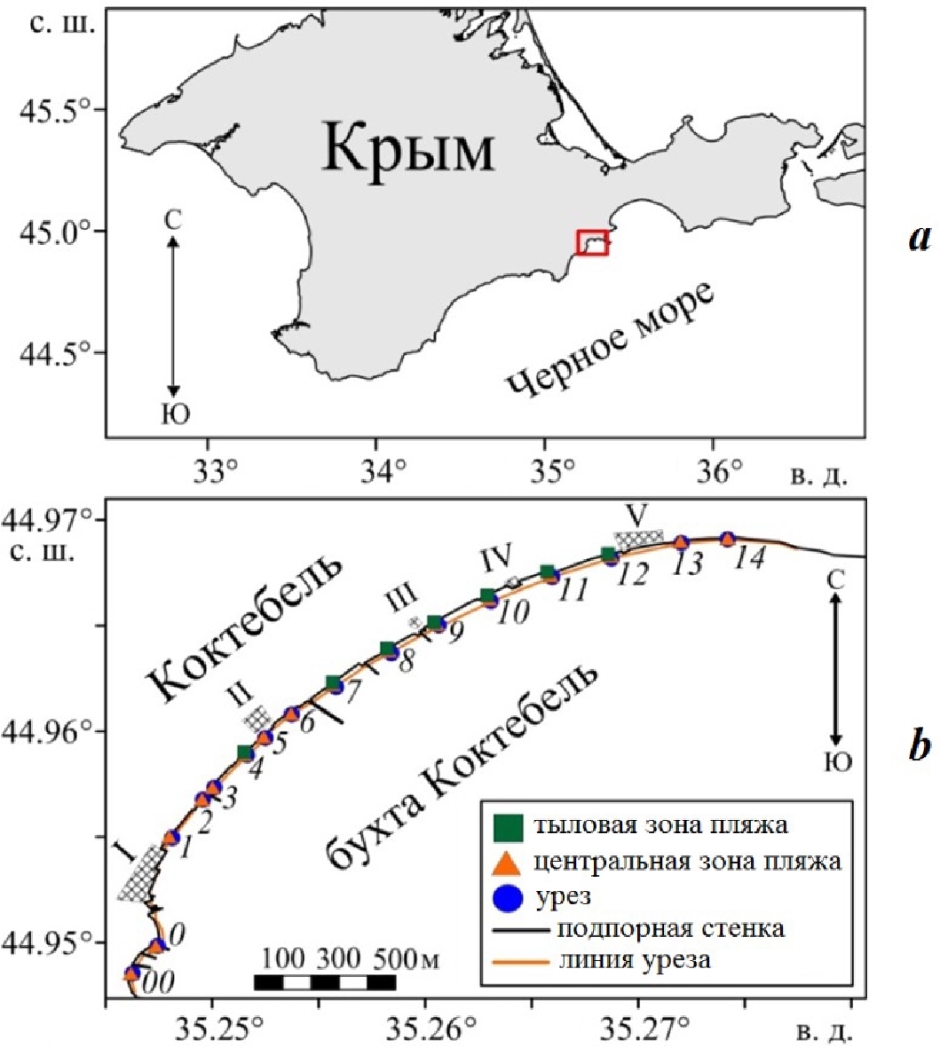 Fig. 1. Location of the study area (the red rectangular) (a); a map of soil sampling from the beach surface and the shoreline in the swash zone on the Koktebel Bay coast, 2021 (the Arabic numerals denote station numbers; the Roman numerals denote the following objects: I – Beliy Grifon Hotel Resort, II – M. A. Voloshin Memorial House, III – Koktebel Dolphinarium, IV – Junge Hill, V – boat sheds Zhemchuzhina Koktebelya) (b)