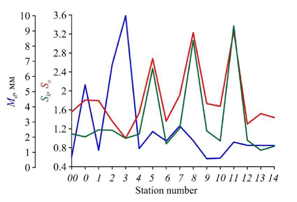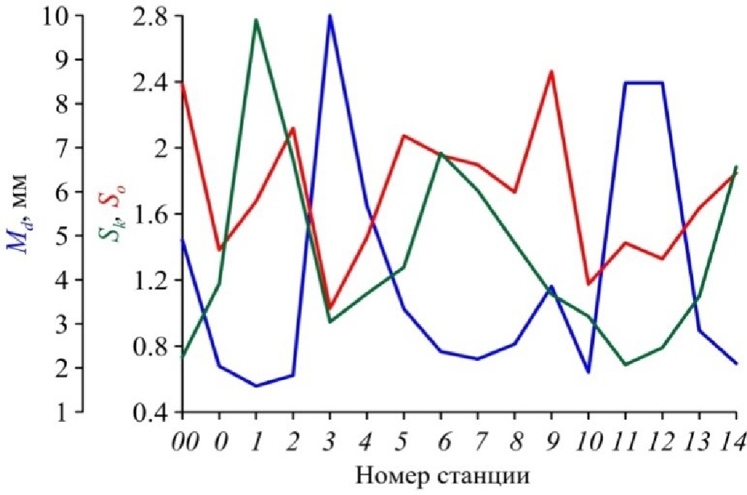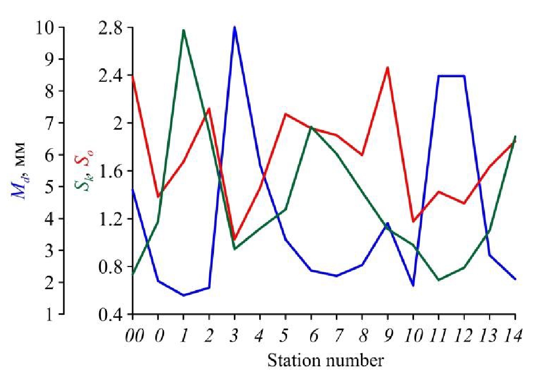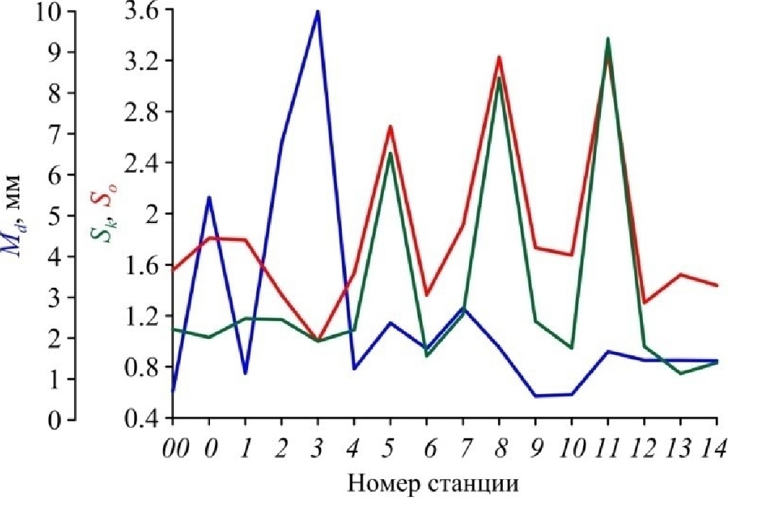 In general, the material in the central section of beaches is medium graded (1.8). The material of gravel-sand beaches in the eastern part of this section and gravel beaches in its western part is well graded, and in the central part the material of beaches is poorly graded (Fig. 6). At stations 5, 8, 11, the bicomponent structure of sediments formed as coarse-grained gravel, as well as coarse and medium-grained sand, leads to the fact that at these stations the sediment material is not graded as much as possible (So is 2.7, 3.2 and 3.3, respectively). The average median diameter was 2.6, which is significantly higher than the values obtained in [9].