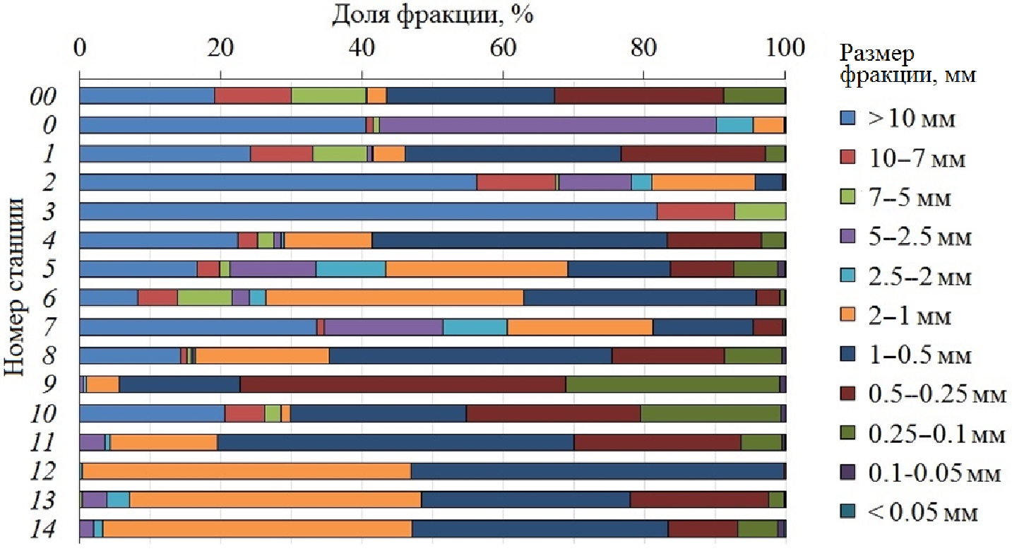 The third area (stations 11–14) is characterized by a gradual decrease in the width of the beaches from 43 to 5 m. As a result, the amount of sand material decreases, and the amount of gravel one increases. A slight increase in the proportion of silty material is explained by its moving from the cliffs composed of clay-sand sediments in the rear section of the beach.