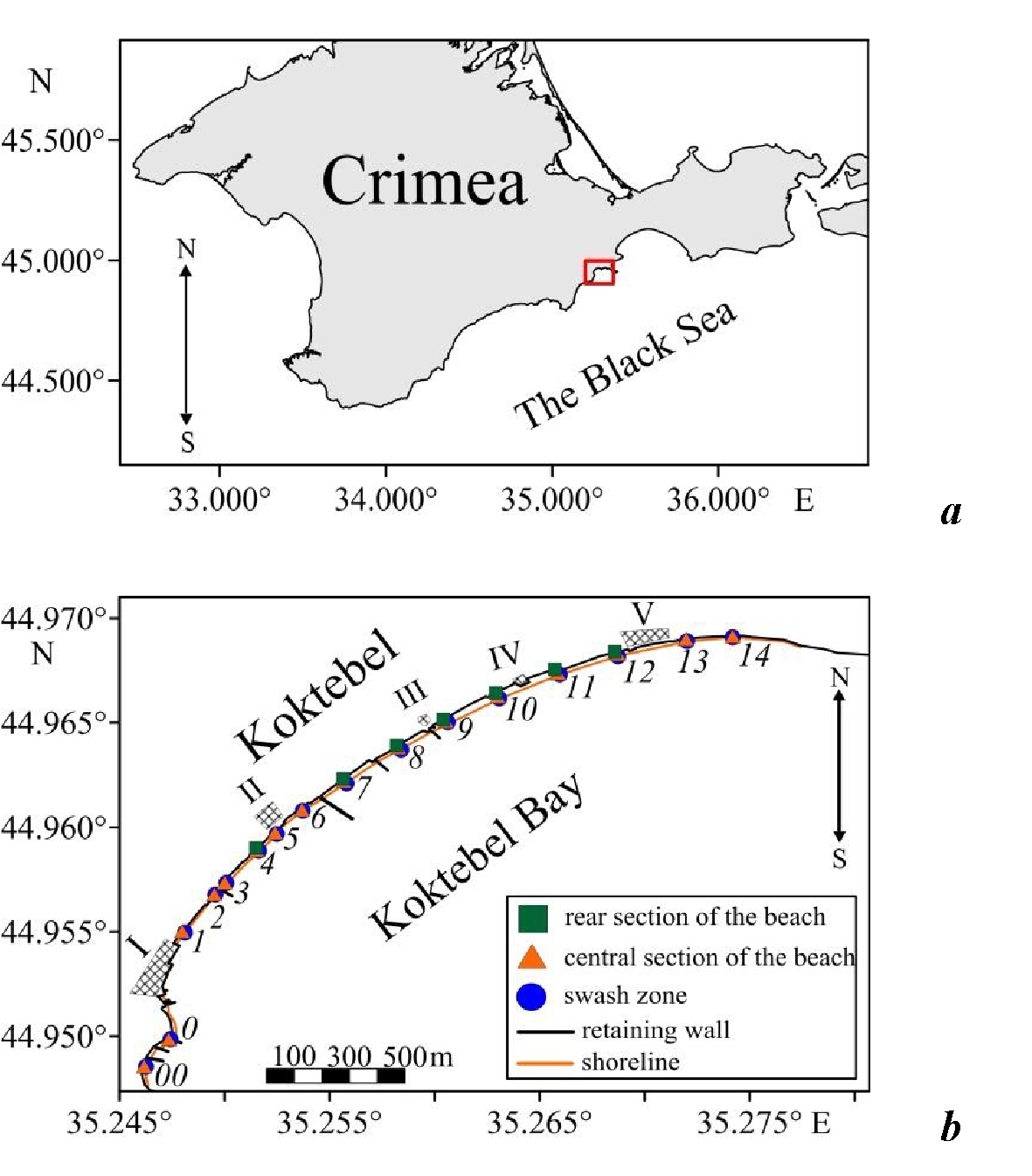 Significant anthropogenic impact on the Koktebel Bay coastal zone (coastline concreting, construction of dams, piers, dwelling, recreational and technical buildings located close to the shoreline) resulted in the disruption of natural processes of sediment material supply and its transport. As a result, the granulometric composition of sediments in the coastal zone (in the swash zone) and in the central and rear sections of beaches differs significantly.
