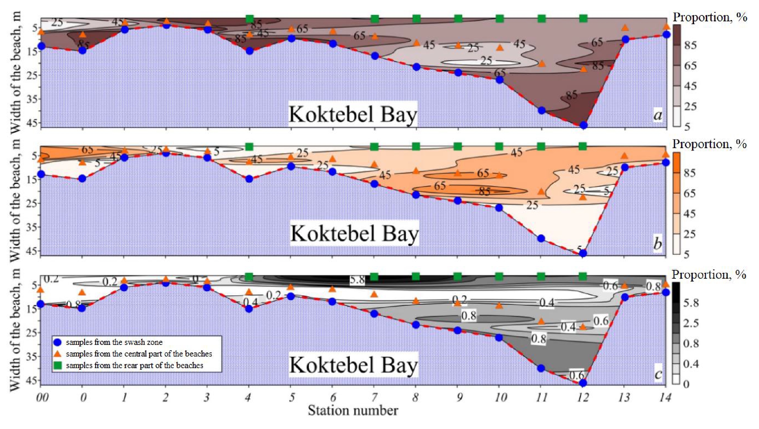 Since the width of the beaches of the Koktebel Bay coastal zone varies significantly, the granulometric composition of sediments in the central and rear sections of the beaches is quite diverse.
