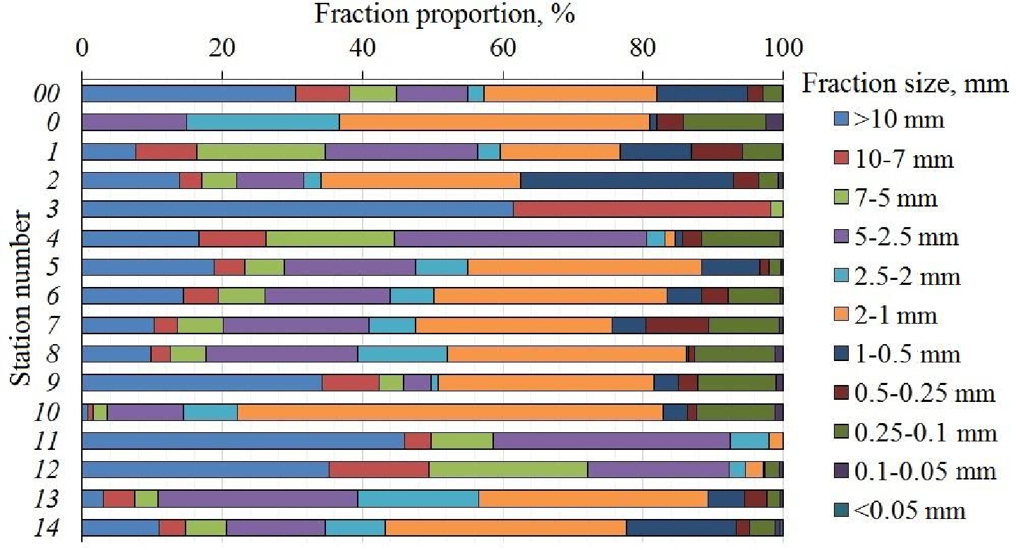 The second area (stations 3–11) is characterized by the material that is heterogeneous in its granulometric composition, which is reflected in the values of the grading coefficient: in the area between stations 4 and 9, it is 1.9 on average (Fig. 4). On the stretch of coastline between stations 3 and 7, a decrease in both the proportion of gravel material and its size is observed. This is stipulated by the filling of beaches in this area, as well as the location of hydraulic structures intercepting sediment material moving along the shoreline. In addition, an increase in the width of the beaches from west to east leads to the movement of sand material into the coastal zone. Thus, the amount of coarse-grained material moving from west to east decreases, and the proportion of sand material coming from the beach to the shoreline increases.