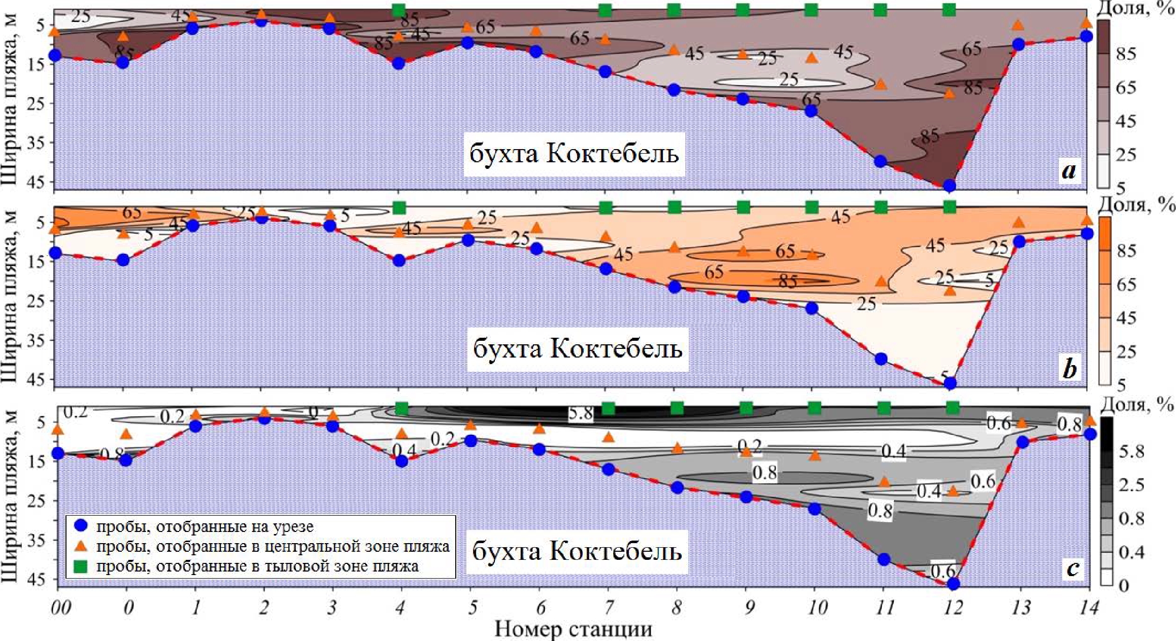 Рис. 2. Пространственное распределение фракций гранулометрического состава: гравийной (а); песчаной (b); илистой (c) – в наносах береговой зоны бухты Коктебель. Пунктиром показана линия уреза воды