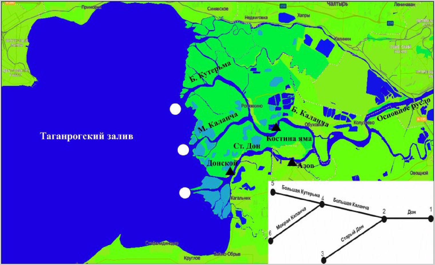 The area of calculation is the mouth section of the Lower Don from the stanitsa of Razdorskaya to Taganrog Bay, including its eastern part. This section consists of the main channel of the Don and its main branches, the Old Don, the Bolshaya Kalancha turning into the Mokraya Kalancha and the Bolshaya Kuterma (Fig. 1). White circles indicate points in Taganrog Bay where calculated water level values were taken, black triangles indicate the hydrological stations where observations were made.