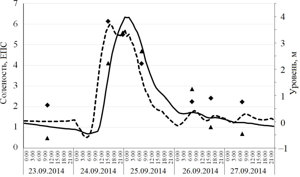 Fig. 2. Water salinity and water level in the water area of the port of Azov from 24 September 2014 to 27 September 2014. The triangles are observed concentration; the solid line is calculated concentration. The diamonds are the observed level; the dashed line is the calculated level