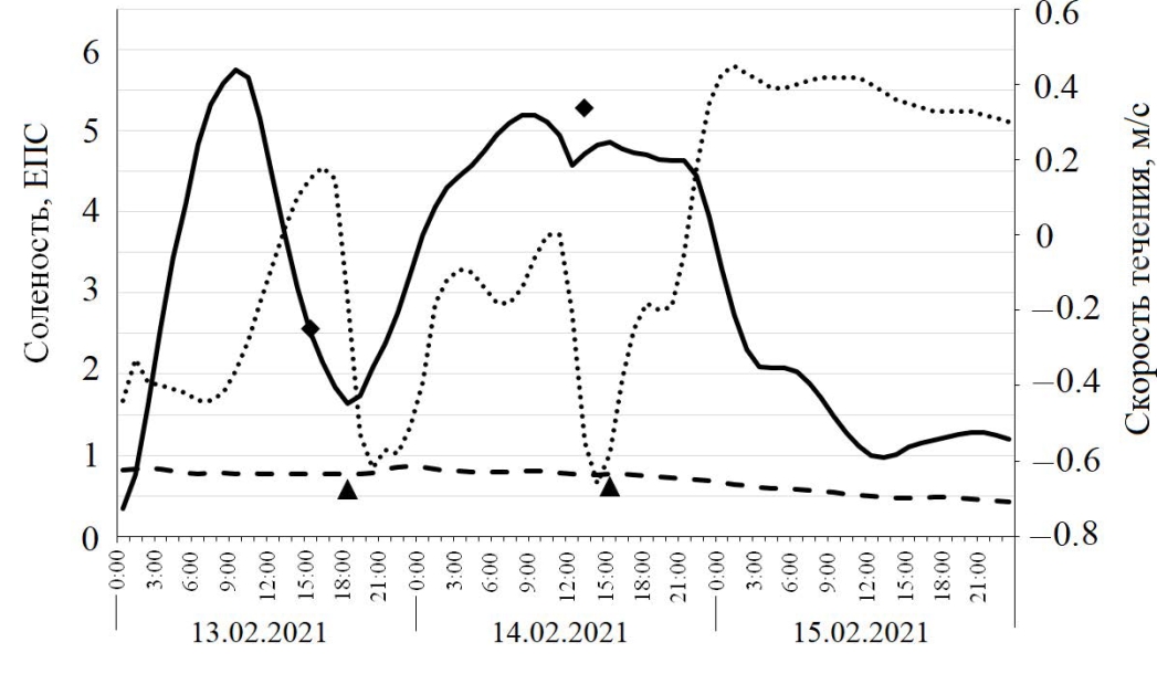 Fig. 3. Salinity and velocity of current in the area of the port of Azov from 13 February 2021 to 15 February 2021. The triangles are the Rostov beach (observed). The dashed line is the Rostov beach (calculated). The diamonds are the port of Azov (observed). The solid line is the port of Azov (calculated). The dotted line is the velocity of current (the port of Azov)