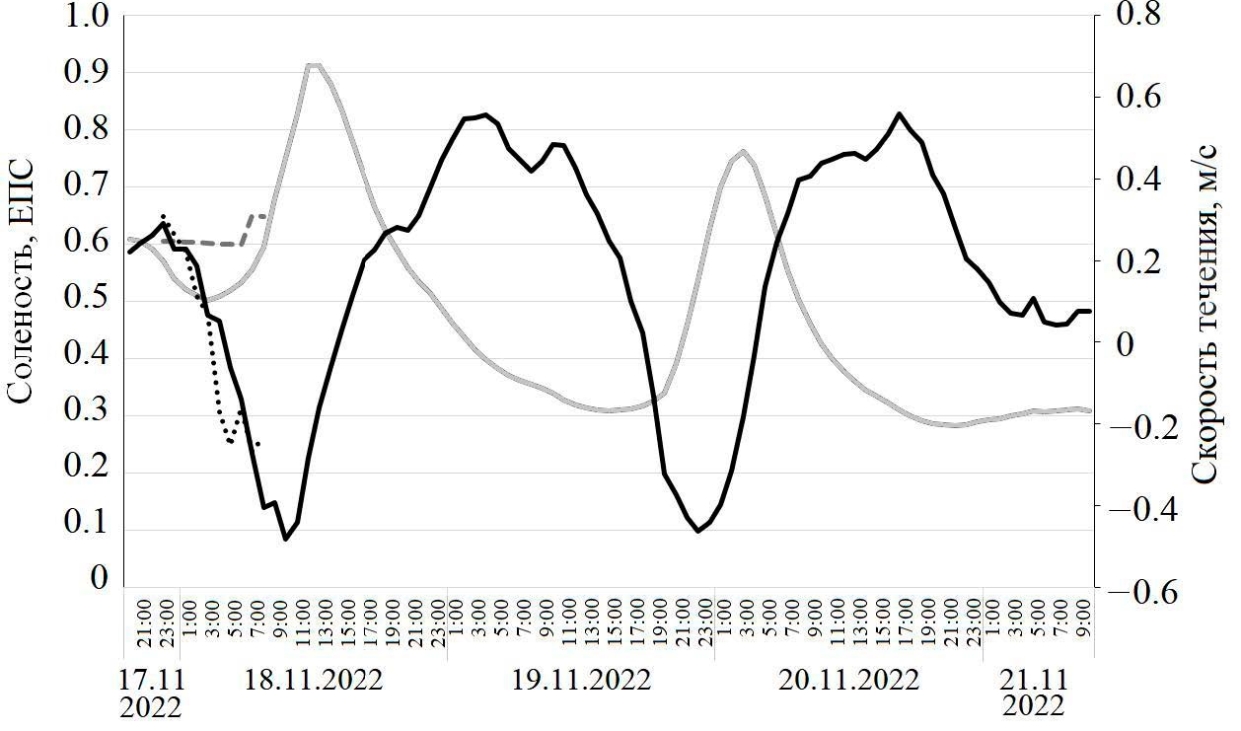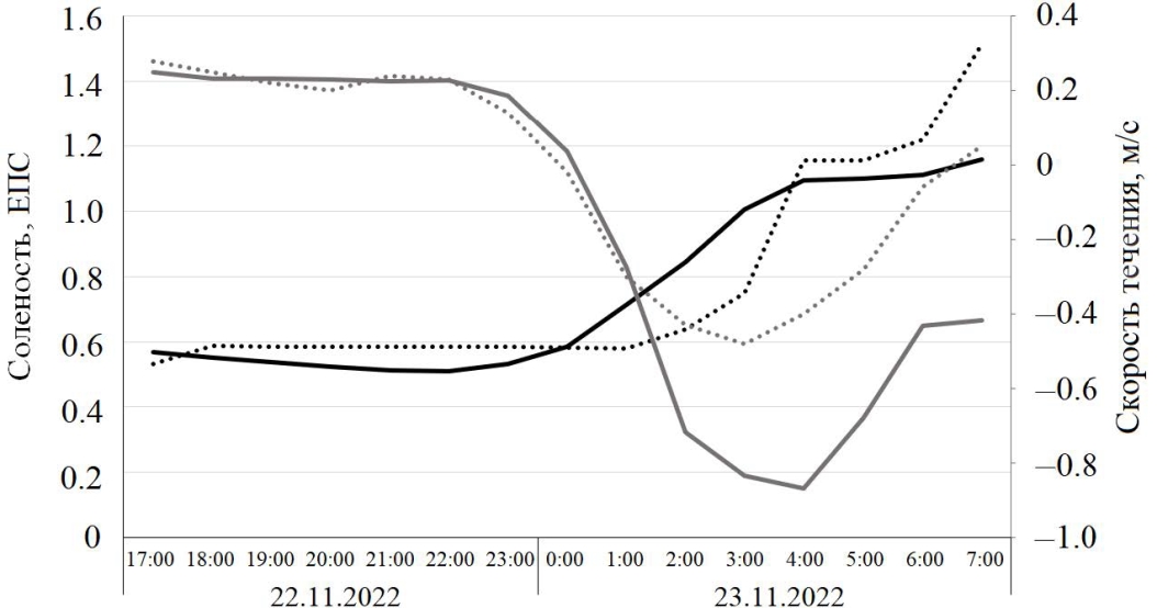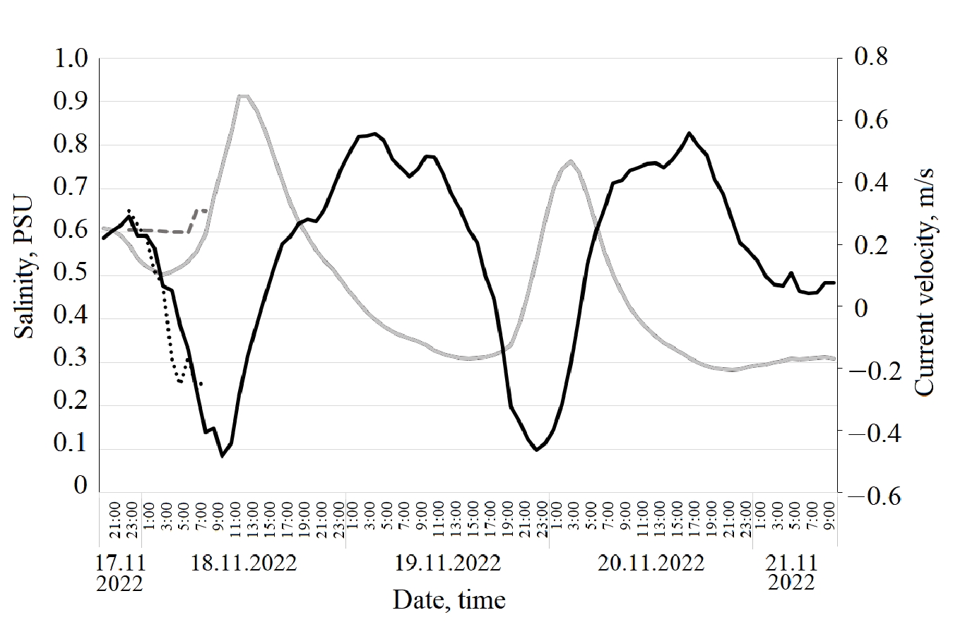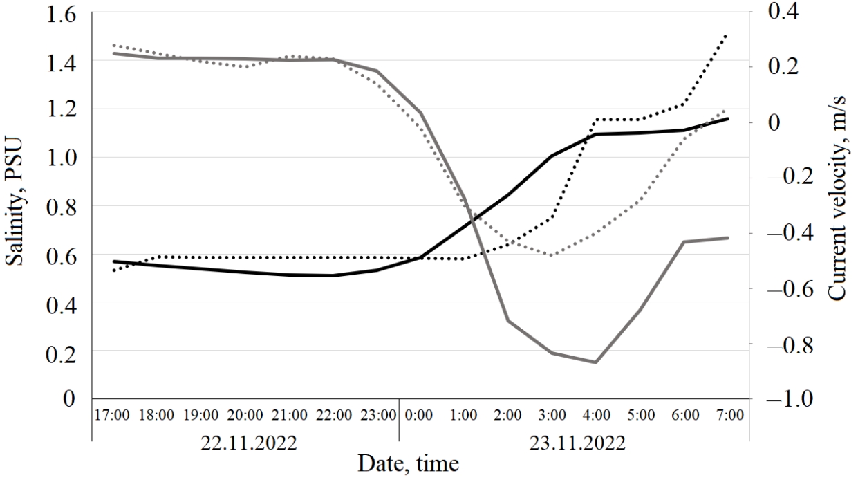 Fig. 4. Salinity and velocity of current at the hydrological station of Donskoy from 22 November 2022 to 23 November 2022. The black lines are salinity; the grey lines are velocity; the solid lines are calculations; the dotted lines are observations