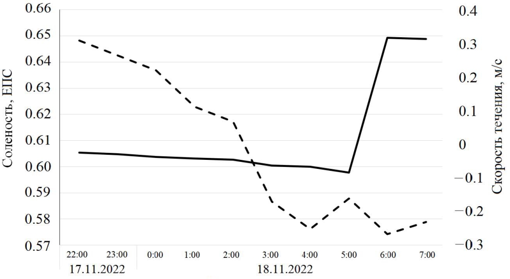 Fig. 7. The dependence of salinity at the hydrological station of Donskoy on the current velocity from 17 November 2022 to 18 November 2022 (observed values). The solid line is observed salinity. The dashed line is observed velocity