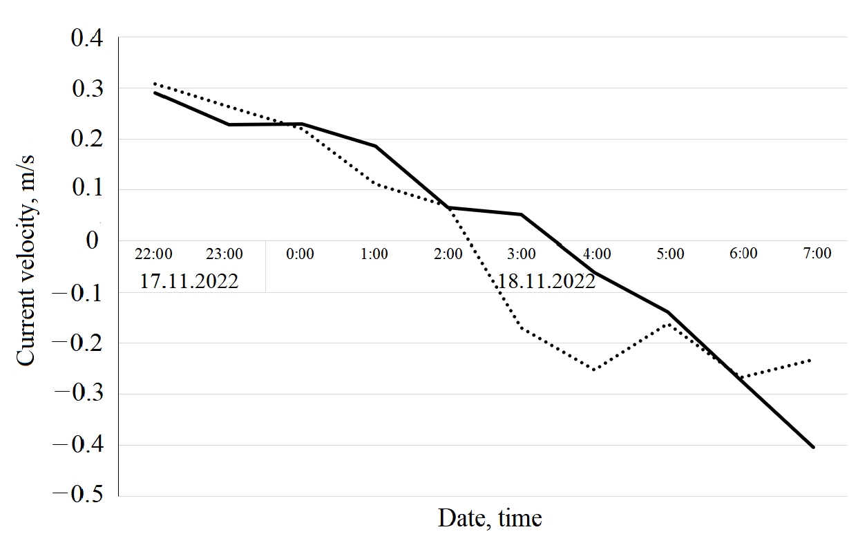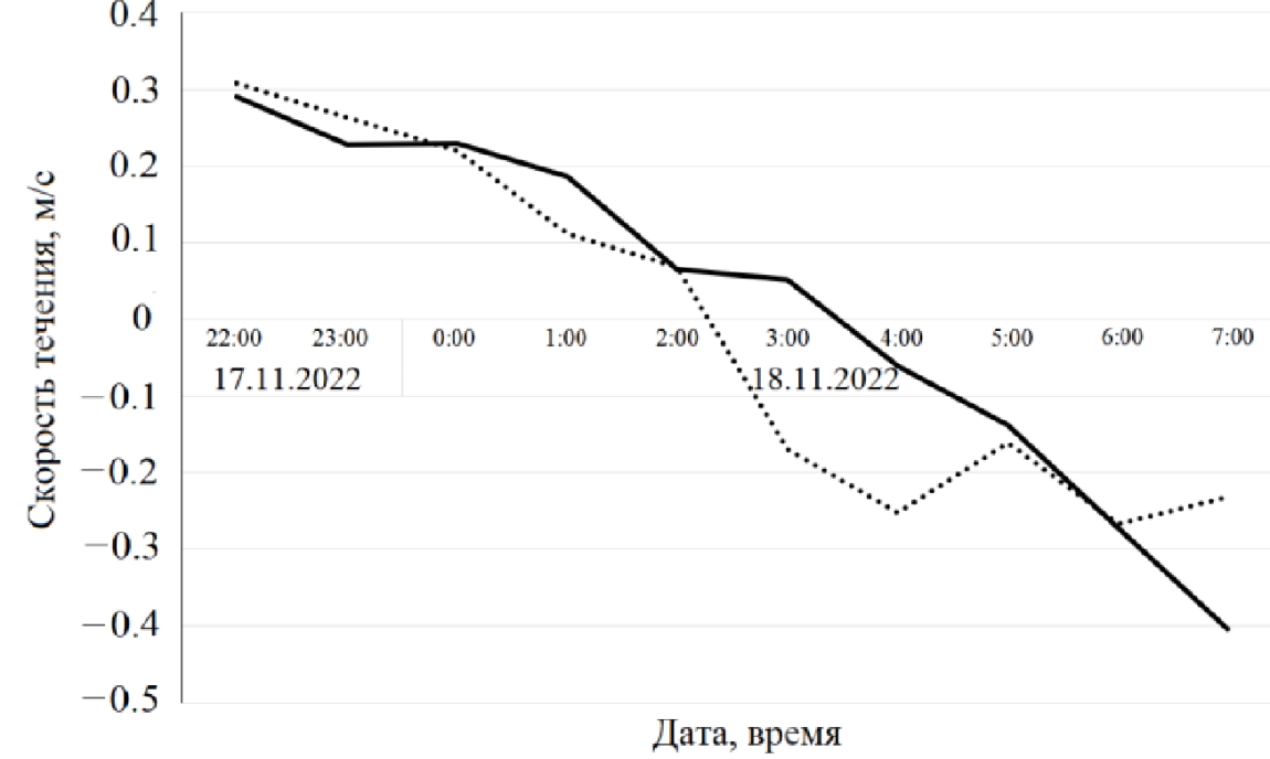 Fig. 8. Calculated and observed values of the current velocity at the hydrological station of Donskoy from 10 p. m. on 17 November 2022 to 7 a. m. on 18 November 2022. The dotted line is observed velocity. The solid line is calculated velocity