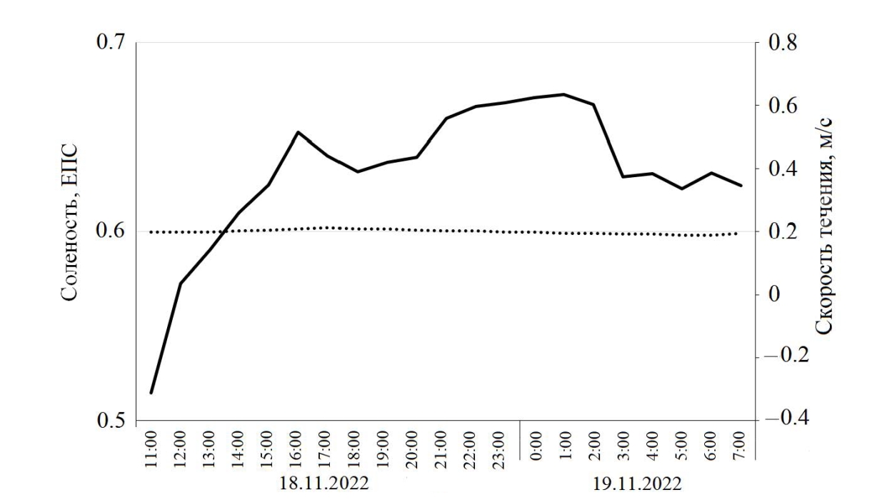 Fig. 9. The dependence of salinity on the velocity of current in the area of Kostina Yama from 18 November 2022 to 19 November 2022 (observed values). The dotted line is observed salinity. The solid line is observed velocity