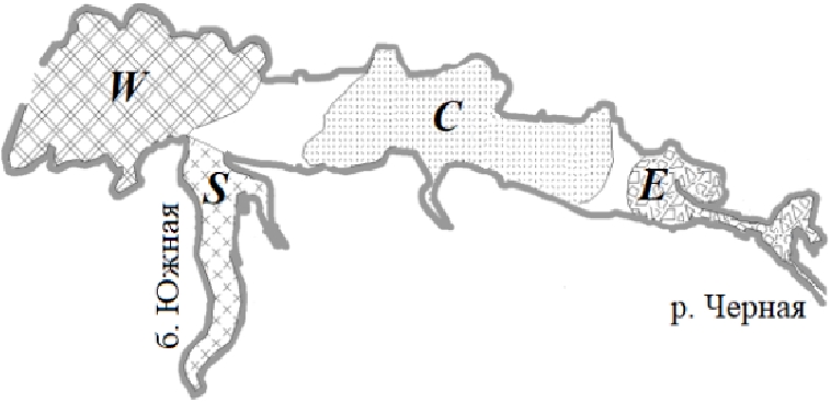 Fig. 1. Zoning of Sevastopol Bay according to the anthropogenic influence level: W – western area, Е – eastern area, С – central area and S – southern area (from work [3])