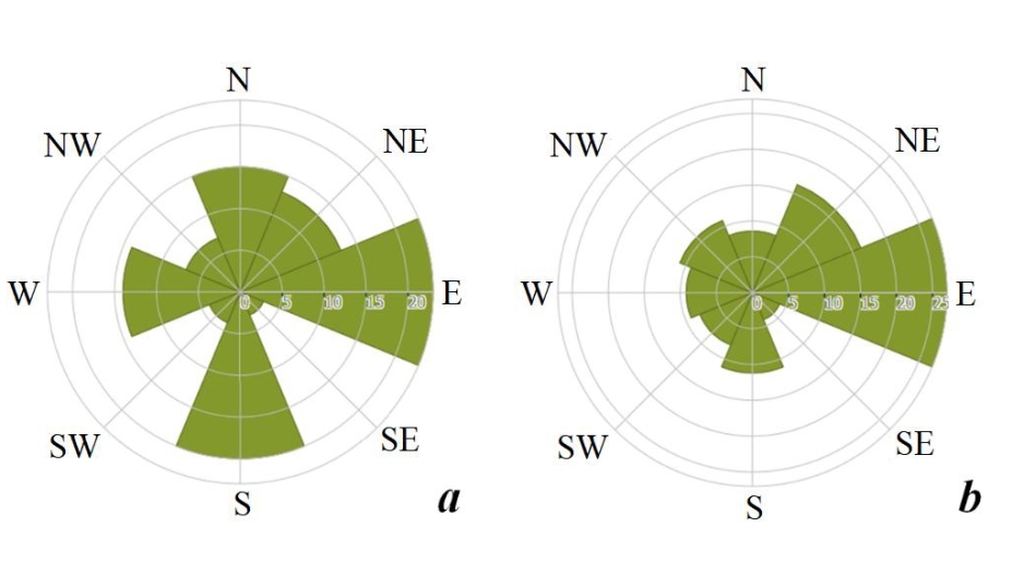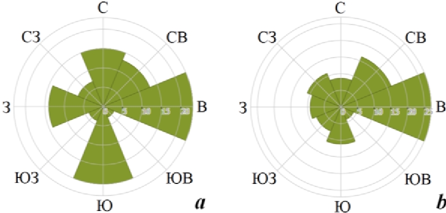 Fig. 3. Wind rose for the Sevastopol water area in 1998–2012 (a) and 2012–2020 (b)