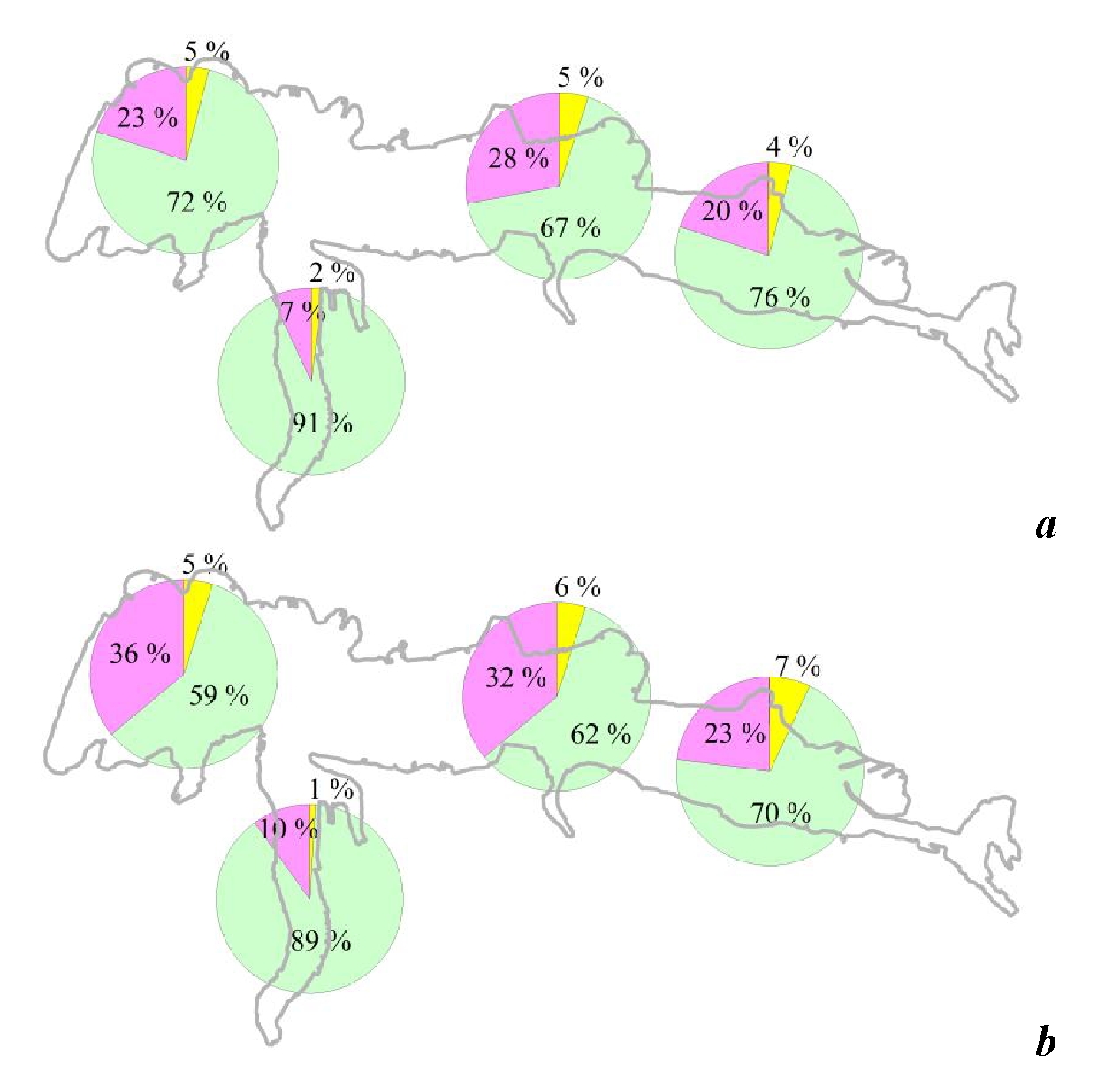 Fig. 2. Distribution of content shares for mineral forms of nitrogen in the Sevastopol Bay in 1998–2012 (a) [6] and 2012–2020 (b). Yellow colour – NO2; green – NO3; pink – NH4