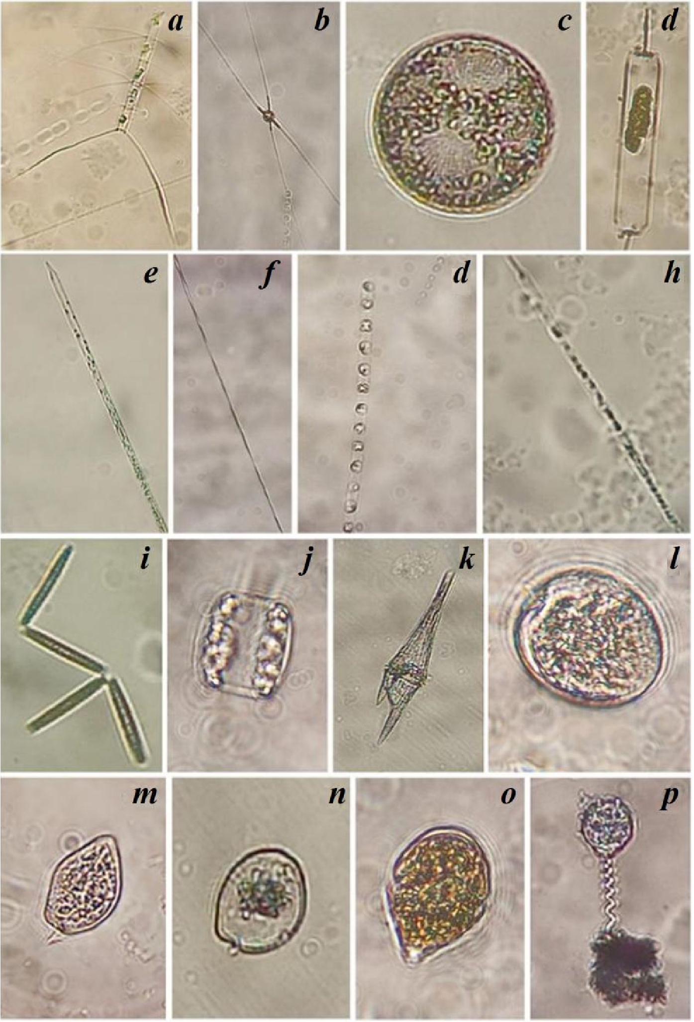 Fig. 2. Phyto- and zooplankton found in the ballast water of the surveyed vessels (light microscope): a – Chaetoceros affinis; b – Chaetoceros danicus; c – Coscino-discus sp.; d – Ditylum brightwellii; e – Proboscia alata; f – Pseudo-nitzschia sp.; g – Skeletonema costatum; h – Sundstroemia setigera; i – Thalassionema nitzschioides; j – Thalassiosira sp.; k – Tripos furca; l – Prorocentrum compressum; m – Prorocentrum micans; n – Prorocentrum scutellum; o – Scrippsiella acuminata; p – Ciliophora gen. sp. (?Vorticella sp.)