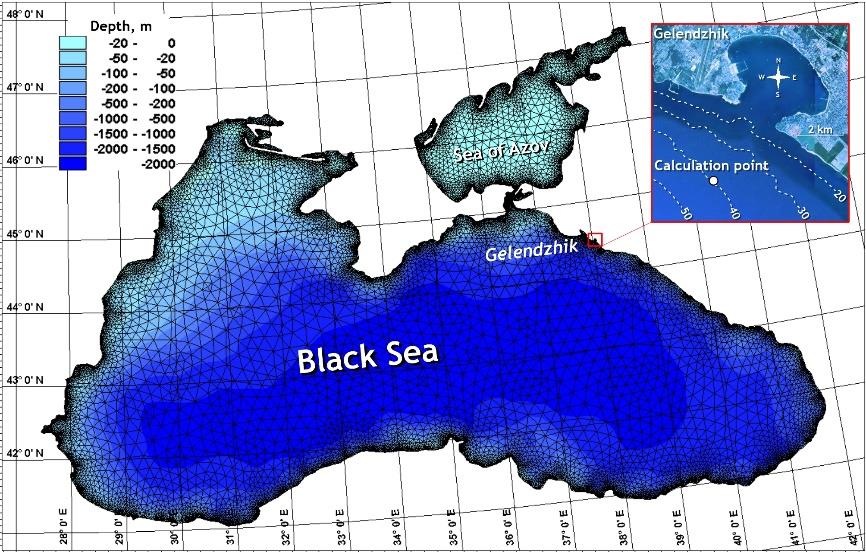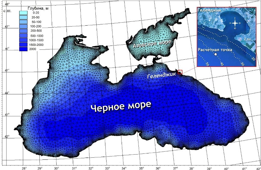 Fig. 1. Calculation grid of the Black Sea and the Sea of Azov. The inset shows the position of the calculation point near Gelendzhik