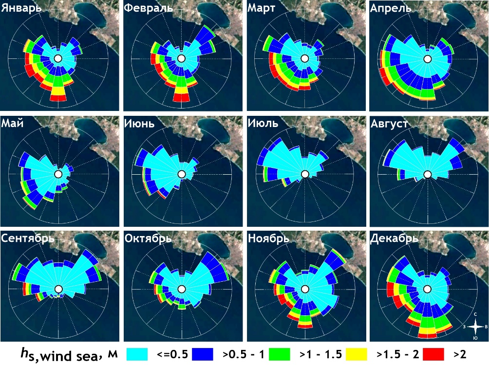 The strongest wind waves are observed in the winter months with mean wave heights of ~0.7 m, and weakest ones – in summer (0.3 m).