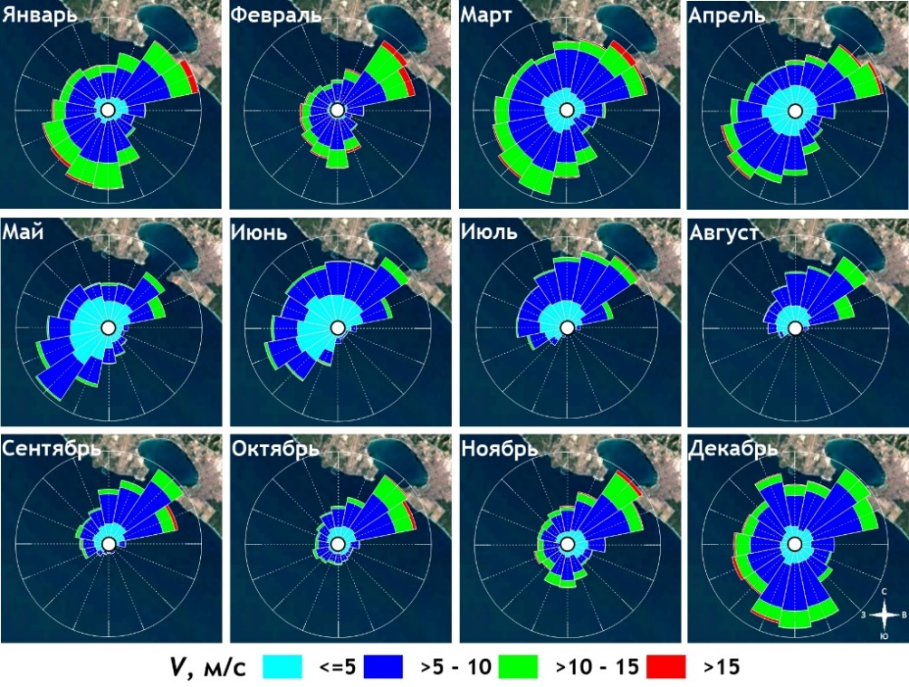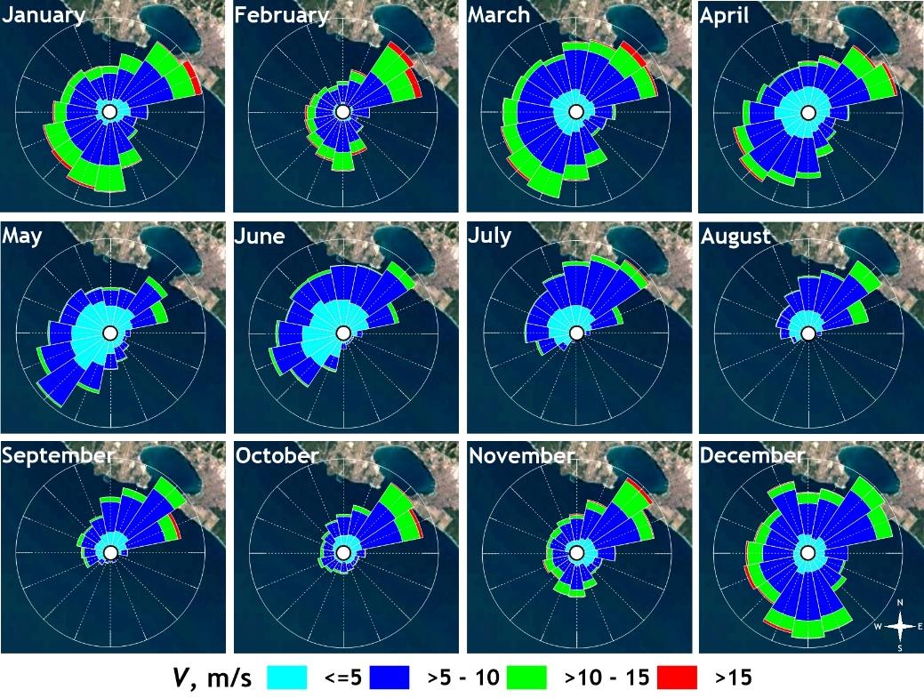 Fig. 4. Monthly surface wind roses near Gelendzhik