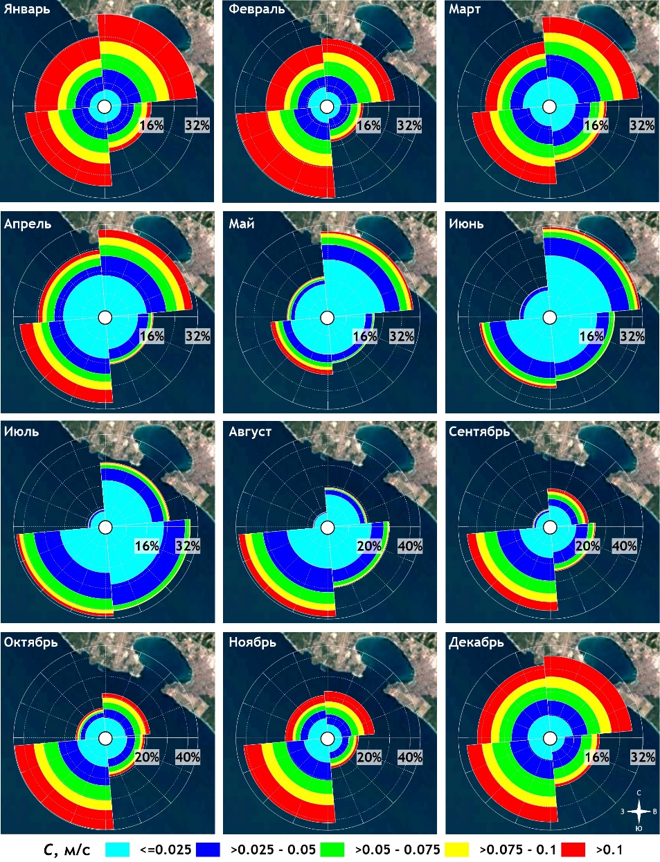 Fig. 7. Monthly roses of the Stokes drift near Gelendzhik