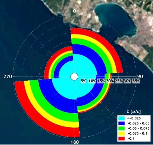 Pursuant to Fig. 8, the long-term repeatability of the Stokes currents in directions is as follows: towards the coast – 27.4%, towards the southeast – 20.9%, away from the coast – 34.3%, towards the northwest – 17.4%. In general, the flow directed to the open sea predominates climatically. The repeatability of alongshore flows directed towards the southeast and northwest is almost the same.