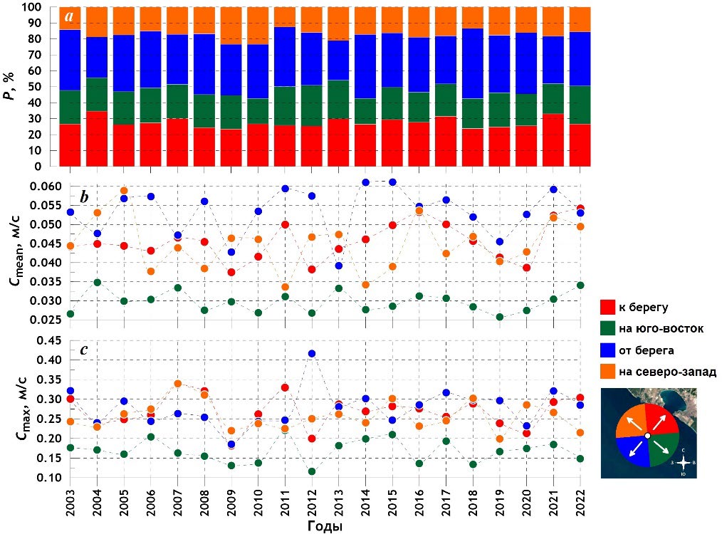 Fig. 7 shows seasonal features of the Stokes drift velocities and directions. Note that in accordance with well-established oceanographic traditions, the direction of the Stokes currents is determined relative to the side of the world towards which they are headed (the direction of waves and wind – from the side). For convenience of consideration and taking into account the general orientation of the coastline, the repeatability of the Stokes drift is calculated for four 90° sectors conditionally defining the following directions of currents: towards the coast, along the coast towards the southeast, away from the coast, along the coast towards the northwest.