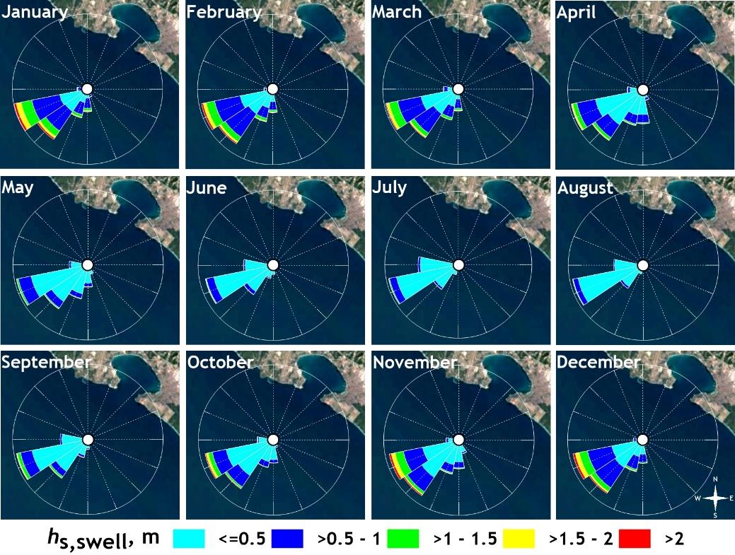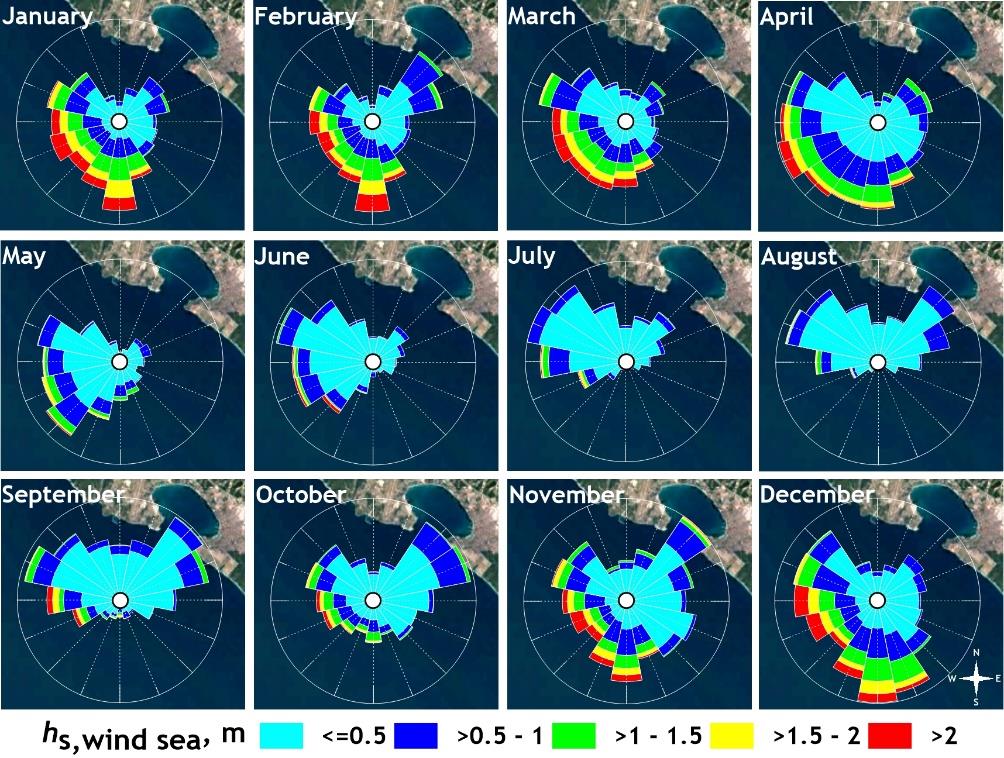 Pursuant to Fig. 5, wind waves in the west-southwest and northeast directions have the greatest repeatability while the strongest waves develop in the south-southeast-west sector. As in all seasons separately, the swell waves of the west-southwest and southwest directions dominate in the interannual sense. The prevailing wind is in the northeast directions, the least repeated wind is in the southeast directions.