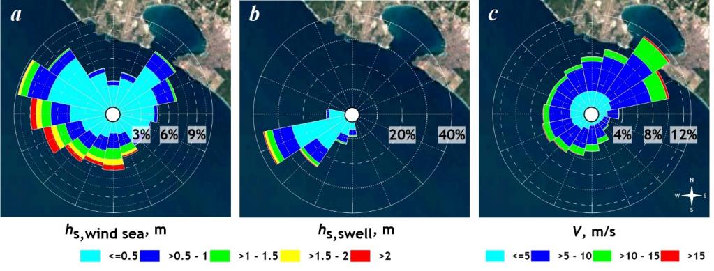 Fig. 5 shows generalizing climatic roses for wind waves, swell waves and surface wind constructed over 20 years from 2003 to 2022.