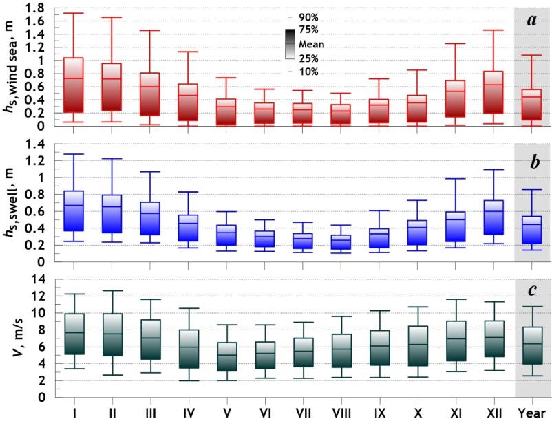 Fig. 6 shows the so-called whisker boxes giving a visual graphical representation of certain statistical characteristics (mean distribution, 1st and 3rd quartiles (or 25th and 75th percentiles), 10th and 90th percentiles) of wave height and wind velocity values separately by month and overall for the year.