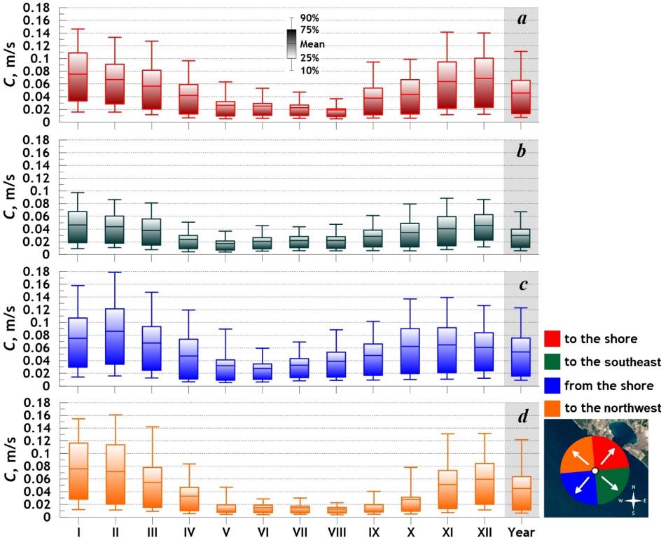 Statistical characteristics of flow velocities also show intraseasonal differences (Fig. 9). The currents directed towards the coast are the strongest ones in December–January (mean velocities ~0.07 m/s), away from the coast – in winter and autumn, especially in February (more than 0.08 m/s), towards the northwest – from November to February. The weakest currents are directed towards the southeast with mean values of 0.04 m/s in winter. The extremely insignificant transport (mean velocities less than 0.02 m/s) towards the coast and towards the northwest is observed in August, in May – towards the southeast, in July – towards the sea. In general, currents towards the sea have the highest mean annual velocities (almost 0.06 m/s). They are followed by currents towards the coast and towards the northwest (~0.05 m/s) and alongshore currents towards the southeast (~0.03 m/s).