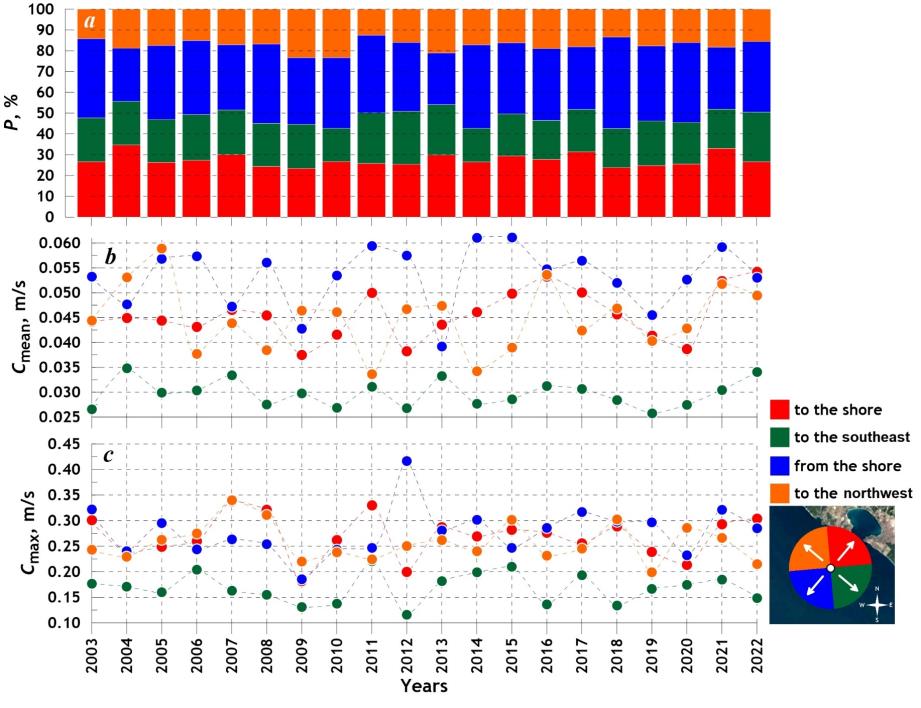 Fig. 10 shows interannual variability of the Stokes drift velocities. According to the data, despite the climatic dominance of flows directed towards the sea, currents towards the coast can prevail in some years (e.g., in 2004 and 2021). The mean annual repeatability of the Stokes drift by 90° sectors is as follows: towards the coast – 23.4–34.7%, towards the southeast – 16.1–25.5%, away from the coast – 24.8–44.1%, towards the northwest – 12.6–23.3%. The mean annual current velocities vary as follows: towards the coast – 0.037–0.054 m/s, towards the southeast – 0.025–0.035 m/s, away from the coast – 0.039–0.061 m/s, towards the northwest – 0.033–0.059 m/s. The maximum velocities are an order of magnitude higher than the mean values. Intraannual maximum velocities also vary widely: towards the coast – 0.18–0.34 m/s, towards the southeast – 0.12–0.22 m/s, away from the coast – 0.19–0.42 m/s, towards the northwest – 0.20–0.34 m/s. The maximum Stokes drift velocity amounting to 0.42 m/s was observed in 2012 with the currents directed towards the open sea.