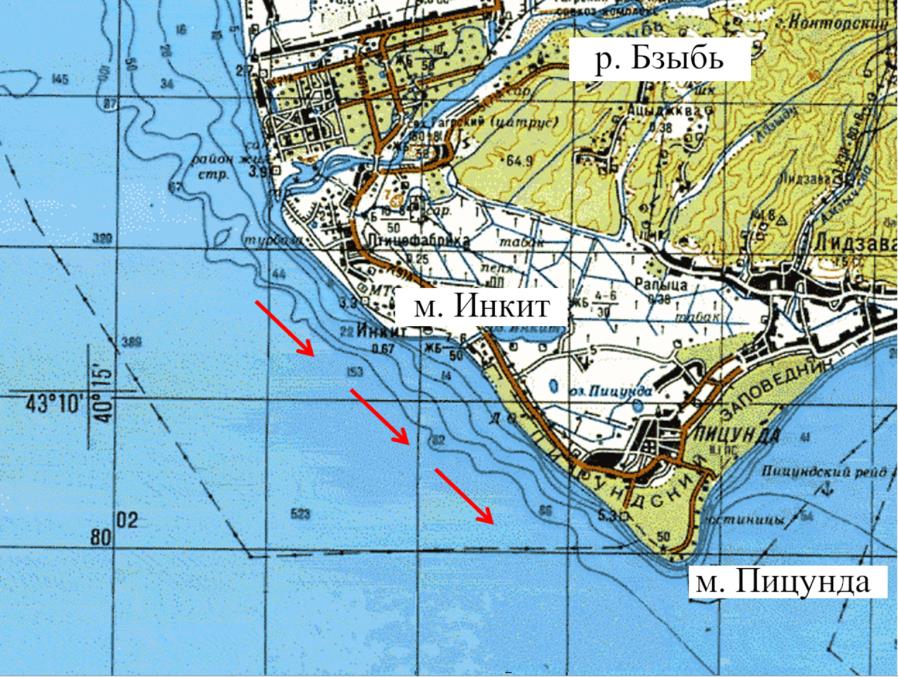 Исследуемый участок берега расположен на юго-западном фланге Пицундского п-ова между мысами Инкит и Пицунда. Прилегающий участок дна между устьем р. Бзыби и м. Пицунда осложнен разветвленной системой подводных каньонов, вершины которых подходят близко к берегу. Наиболее крупным из них является каньон Акула [1], выходящий к Инкитскому мысу (рис. 1). Наличие на подводном склоне эрозионных ложбин усложняет береговые процессы.