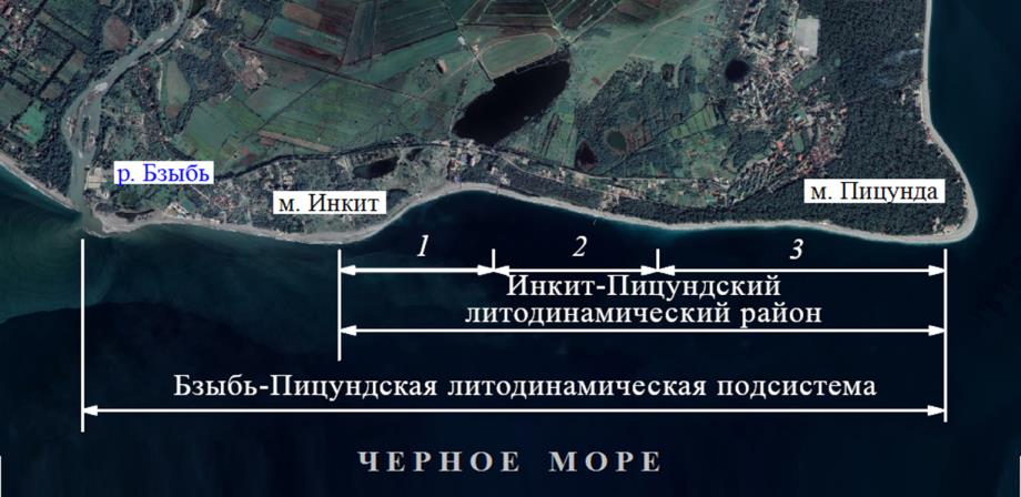 В выделенной Бзыбь-Пицундской литодинамической подсистеме, исходя из влияния конфигурации береговой линии (выступающий в море м. Инкит) на вдольбереговой поток наносов, можно выделить Бзыбь-Инкитский и Инкит-Пицундский литодинамические районы. Внутри Инкит-Пицундского литодинамического района, с учетом конфигурации береговой линии, можно выделить три литодинамических участка (рис. 2):