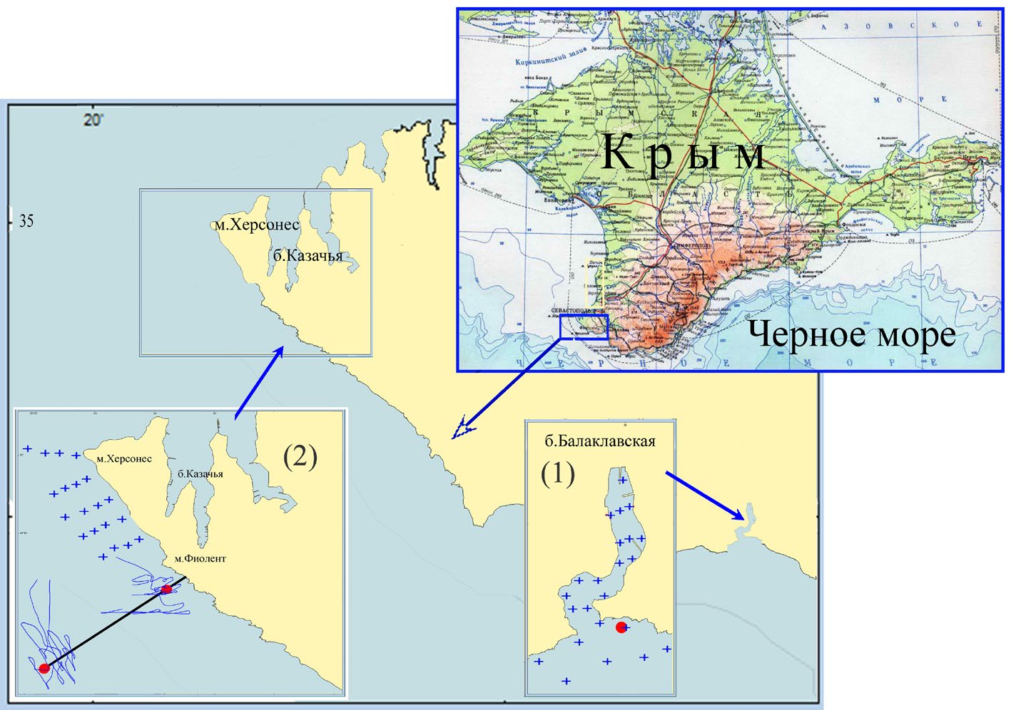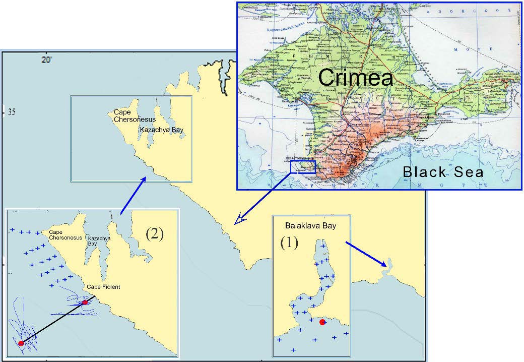 In [1], the first results of these studies with a comprehensive estimate of the flow of sources and the level of pollution of the marine environment, analysis of hydrophysical processes and hydrochemical parameters have been published. In particular, they concern two main most polluted open sites of the Sevastopol coastal area: 1 – at the entrance to Balaklava Bay, 2 – near the southwestern section of the coast of the Heraclean Peninsula (area of Cape Fiolent), where the Balaklava and Sevastopol domestic wastewater sewers are located (Fig. 1).
