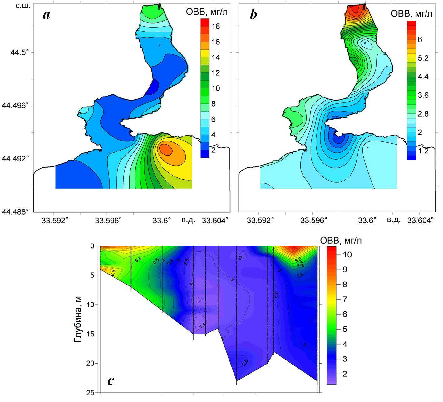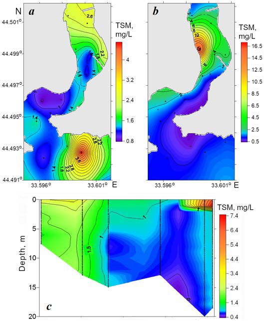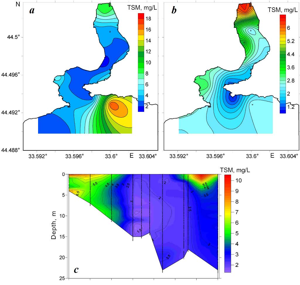Fig. 2. TSM concentration in the area of Balaklava Bay in August 2006: a – in the surface layer; b – near the bottom; c – at the longitudinal transect of the bay [8]