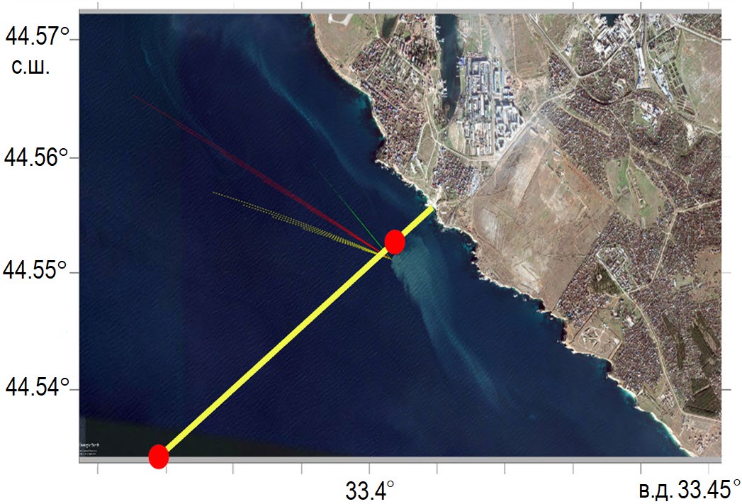 Fig. 4. Satellite image (http://dvs.net.ru/SWCrimea/stoki_ru.shtml) of the studied water area with a scheme of a pipeline of sewage facilities Yuzhnye. The red dots are for discharge outlets