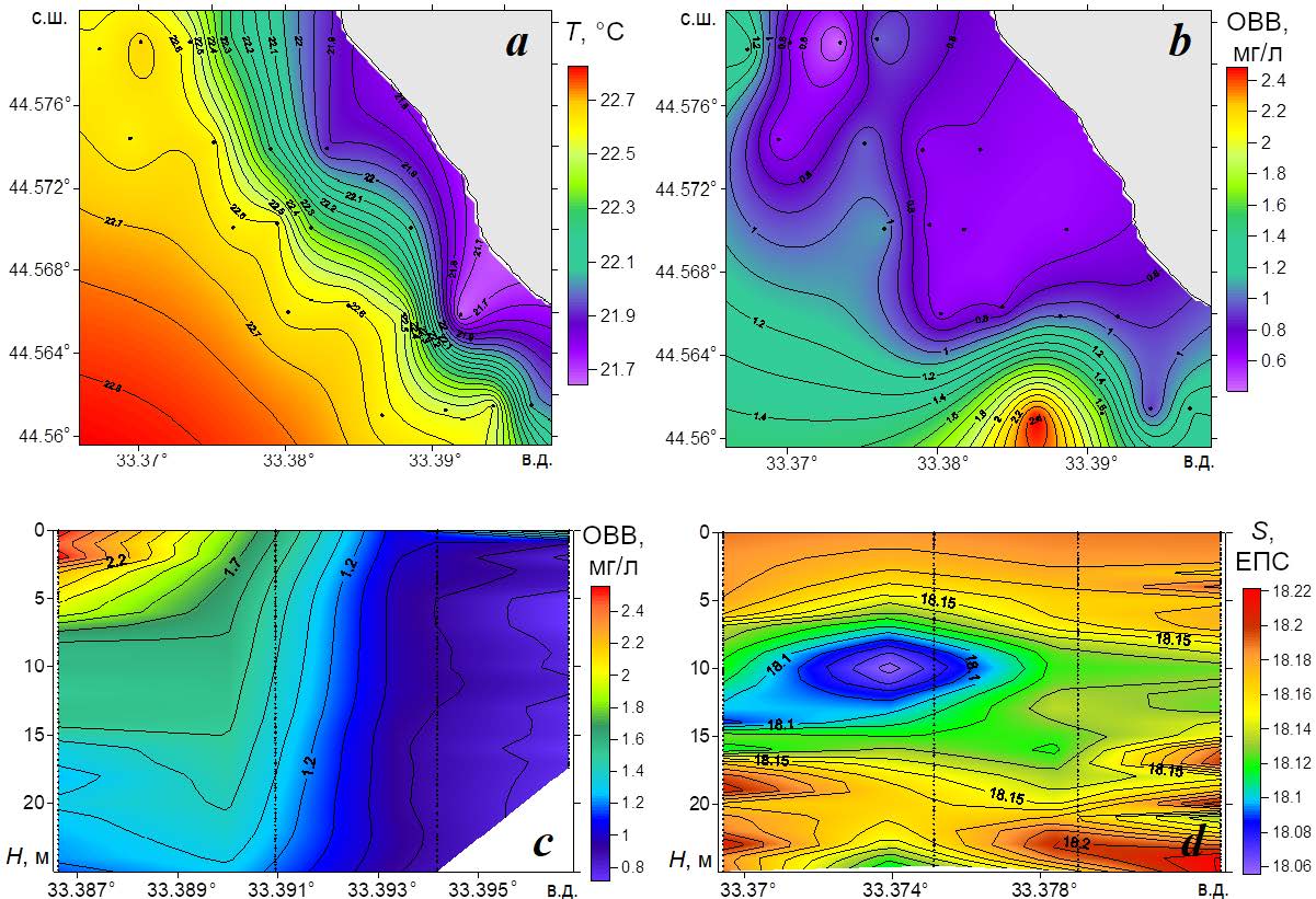 In August 2019, the MHI researchers conducted a comprehensive oceanological survey at a test site located half a mile northwest of the pipeline of sewage facilities Yuzhnye under conditions of strong northeasterly offshore winds (Table, Fig. 1). This successful experiment made it possible to understand the features of water structure and the TSM distribution from real sources of pollution in a situation of upwelling and maximally stratified water column.