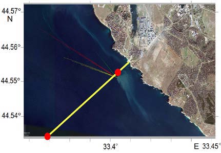 Let us note the peculiarity of the structure of this water area – here, a constant (main) pycnocline corresponding to the main Black Sea halocline is observed at depths from 50 to 100 m. A known source of pollution in this coastal area is wastewater from sewage facilities Yuzhnye, City of Sevastopol [1]. The pipeline head of these structures is located at a distance of ~3 km from the coast at a depth of 88 m. In 2014, a leak developed in the underwater pipeline at a distance of ~ 700 m from the coast at a depth of 34–37 m, which turned into a significant source of anthropogenic suspended matter [1].