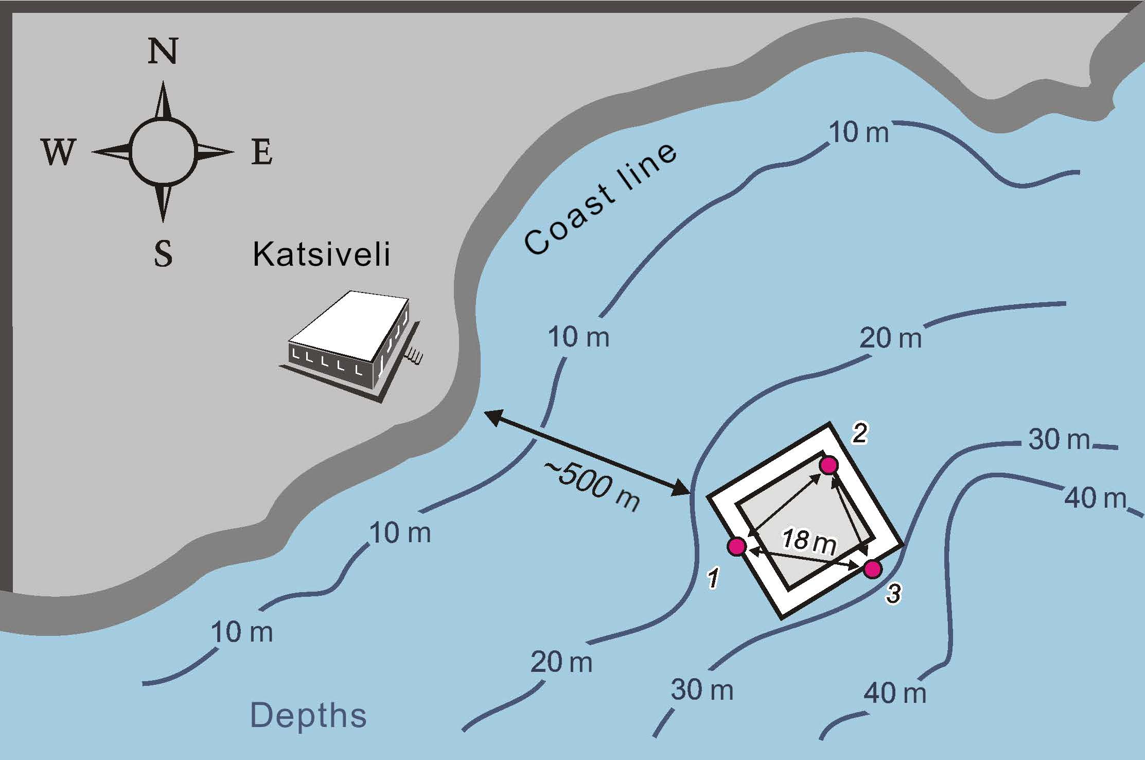 Fig. 1. Location and layout of a system of three thermoprofilemeters at the oceanographic platform. The red dots denote the installed thermoprofilemeters (1–3)