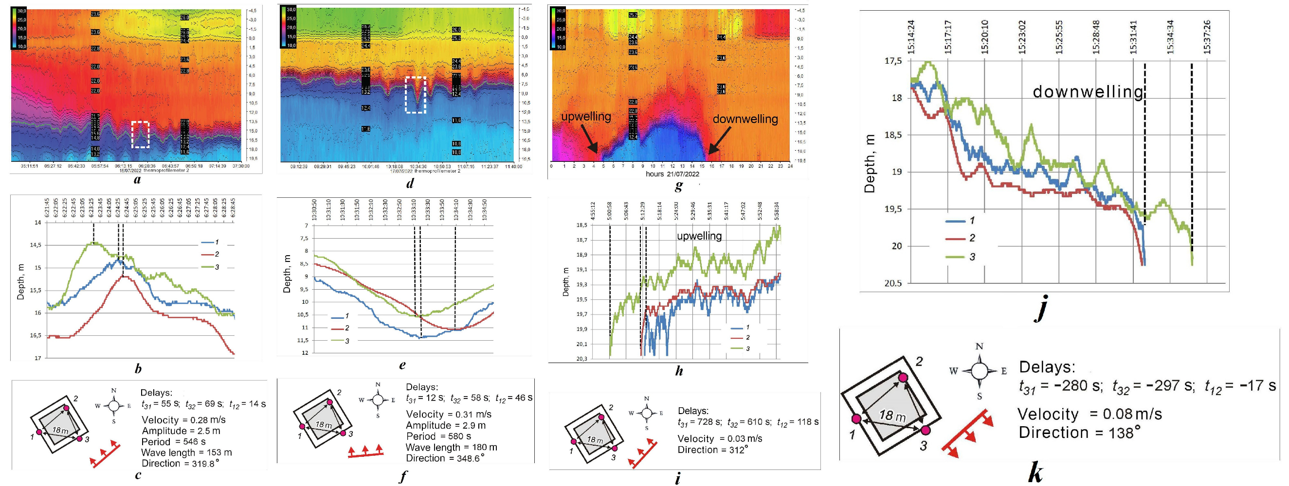 Fig. 4. Display of the results of data processing by the system on the monitor screen: temperature field with isotherm dynamics and temperature profile gradient – a, d, g (the white rectangle (a, d) and arrows (g) indicate the calculation area); correlated spatial displacements of the selected isotherm in the calculation area at the boundary of the temperature front and internal wave for three thermoprofilemeters (1, 2, 3) – b, e, h, j (the dashed lines mark on the graphs the selected boundaries of the isotherm spatial displacement in the time range for each sensor); results of program calculation of the dynamic characteristics of internal waves (c, f) based on the obtained time delays (t31, t32, t12) and the velocity and direction of front displacement during upwelling (i) and downwelling (k)