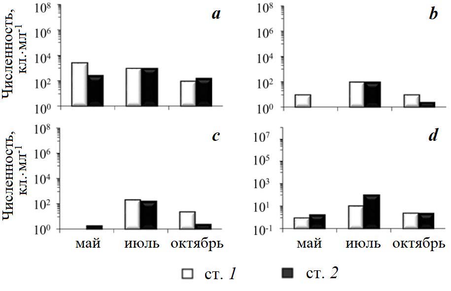 POBs at St. 1 were detected in all samples (Fig. 4, d). The maximum (10 cells×mL–1) was detected at station 1 in July, while in the other samples of St. 1, this group of bacteria was represented by single cells per millilitre of seawater. At St. 2, POBs were also detected in all samples (Fig. 4, d). The maximum (95 cells×mL–1) was detected at St. 2 in July. In other samples, the POB abundance was under 10 cells×mL–1.