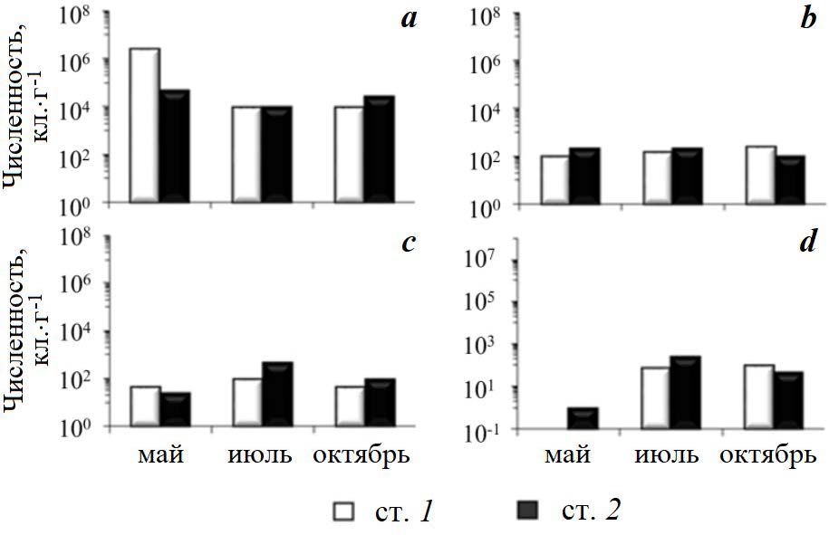 Fig. 5. Dynamics of the abundance (cells·g-1) of heterotrophic (a), hydrocarbon-oxidizing (b), lipolytic (c), phenol-oxidizing (d) bacteria in the fouling