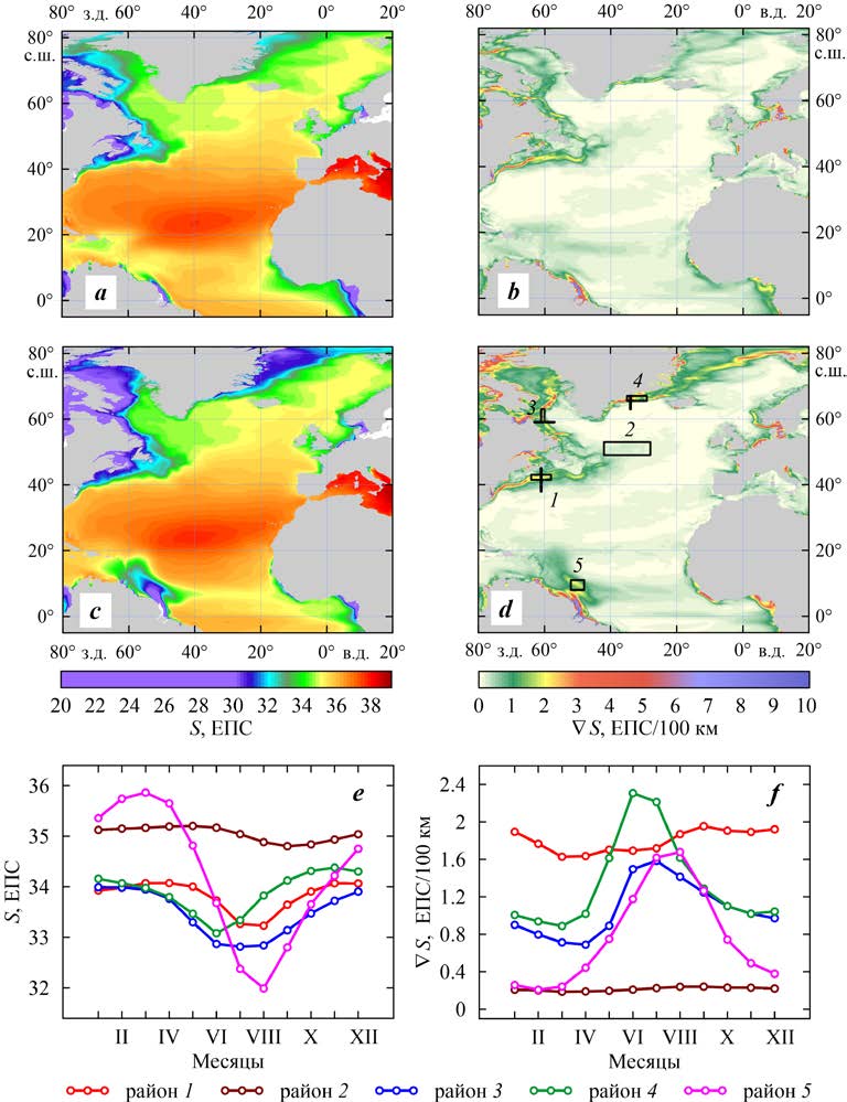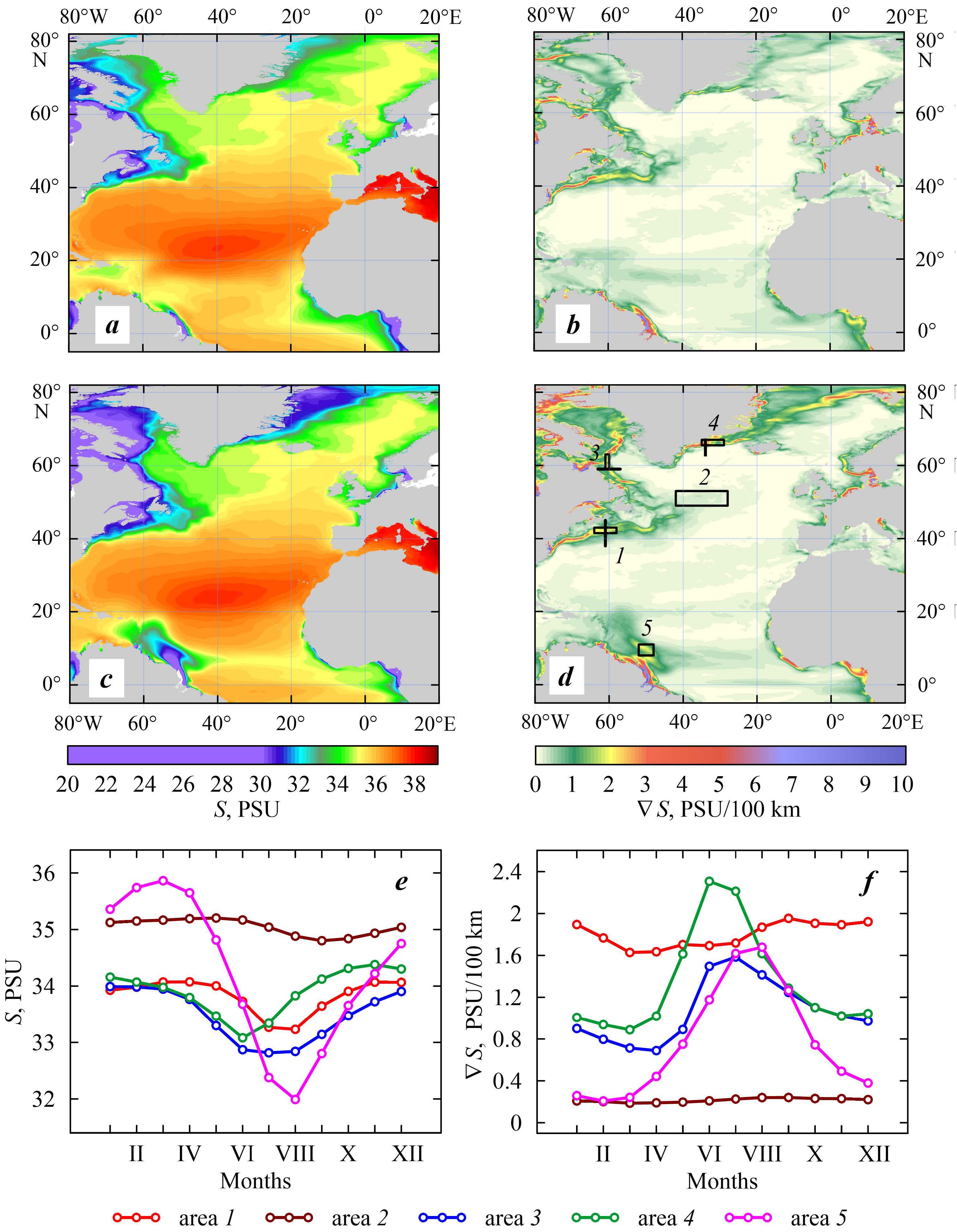 In the Gulf Stream frontal zone, the maximum salinity gradients are found in the area of the Gulf Stream North Wall throughout the year [29] (Fig. 2, b, d). Their values reach 5 PSU/100 km in winter and 4 PSU/100 km in summer. In area 1, maximum salinity is observed in spring [30] and gradients are minimum at this time (Fig. 2, e, f). High salinity gradients are observed in autumn and winter, when seasonal intensification of transport of the Labrador Current and its branch spreading along the Nova Scotia coast occur [24, 31, 32]. The influence of fresh water flow from the Gulf of St. Lawrence and the salinity of the Gulf Stream water are also important [33].