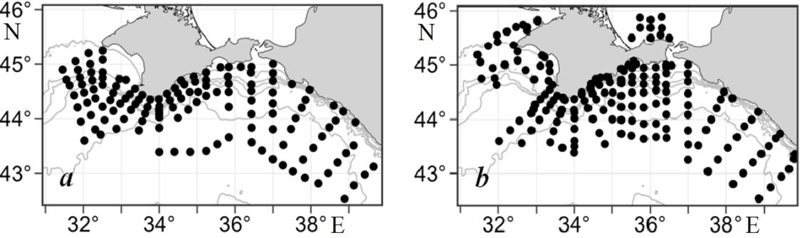 Fig. 1. Examples of oceanographic station grids carried out on board R/V Professor Vodyanitsky: 102nd cruise, June‒July, 2018 (a); 108th cruise, July‒August, 2019 (b)