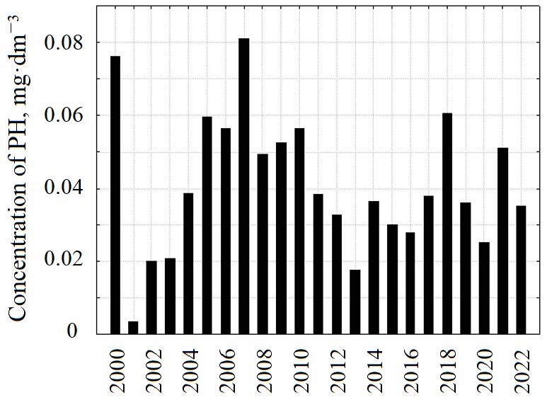 Fig. 5. Interannual variability of the annual concentration of petroleum hydrocarbons (mg·dm−3) on the Crimean shelf according to SOI data