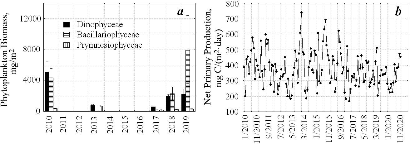Phytoplankton and primary production. Eutrophication of shelf waters as a result of runoff affects the structure and productivity of the phytoplankton community. This has been shown by studies of the broad and shallow northwestern Black Sea shelf on the scale of multiyear variability [10]. The productivity of shelf waters of Crimea is much lower and the taxonomic composition of phytoplankton is very diverse: Dinophyceae alone are represented by 156 taxa of species and intraspecific rank. The genera Protoperidinium, Gymnodinium and Dynophysis dominate by the number of species [38]. In 2010‒2019, the genera Dinophyceae made the greatest contribution (~ 46%) to phytoplankton biomass formation. The share of other groups (Bacillariophyceaе and Prymnesiophyceae) was ~ 39 and 15%, respectively.