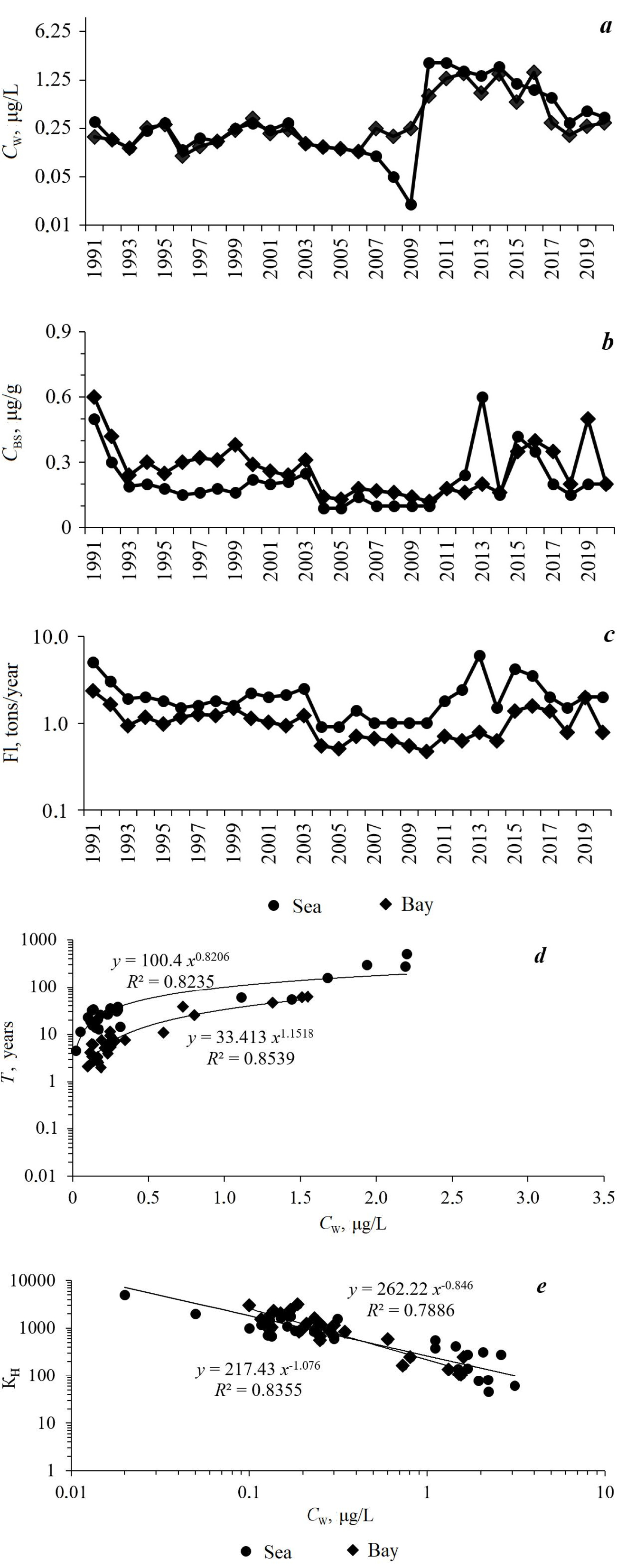 Calculated according to formula (2), the average period of Cd sedimentation turnover in the open sea and in Taganrog Bay at various concentrations in water during the period under study was 70 and 13.7 years, respectively (Fig. 2, d). In general, the process of sedimentation turnover is complex and diverse: before passing into bottom sediments, some chemical elements and their compounds pass from one form to another up to 30–40 times [31].