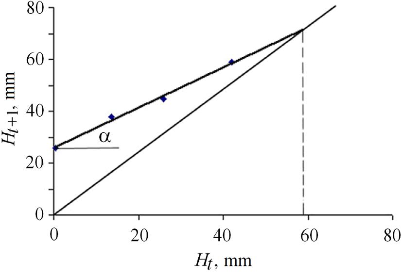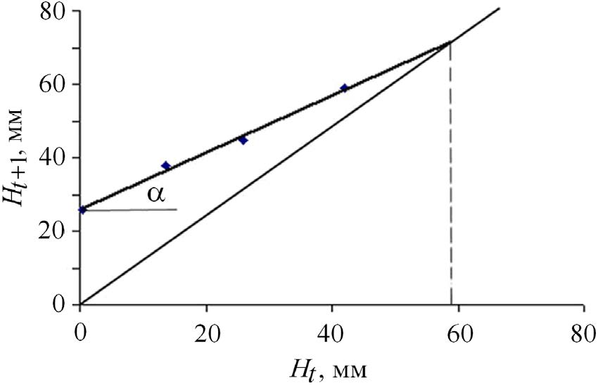 As a result of the analysis of size-frequency distributions, modal sizes of mollusk specimens in age groups of 0.5–2.0 years were obtained. They were then used to create an allometric growth model. The height of the scallop spat shell immediately after the larvae metamorphosis is 0.3 mm 4). The values of the parameters of this equation were found graphically. To construct the graph, the average values of the scallop shell height at age t were plotted on the abscissa axis, and at age t + 1 – on the ordinate axis (Fig. 1).